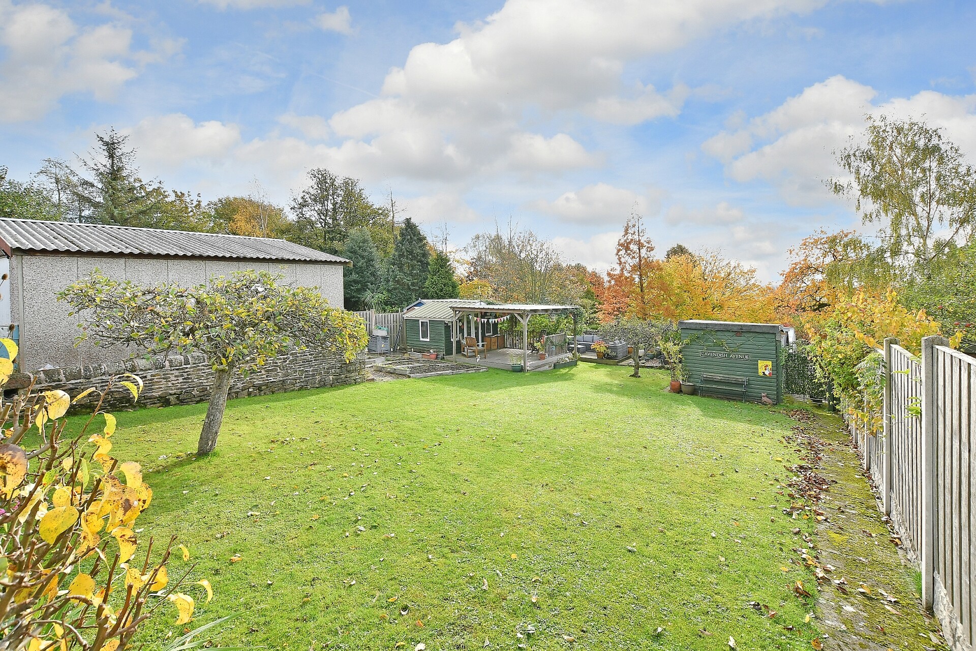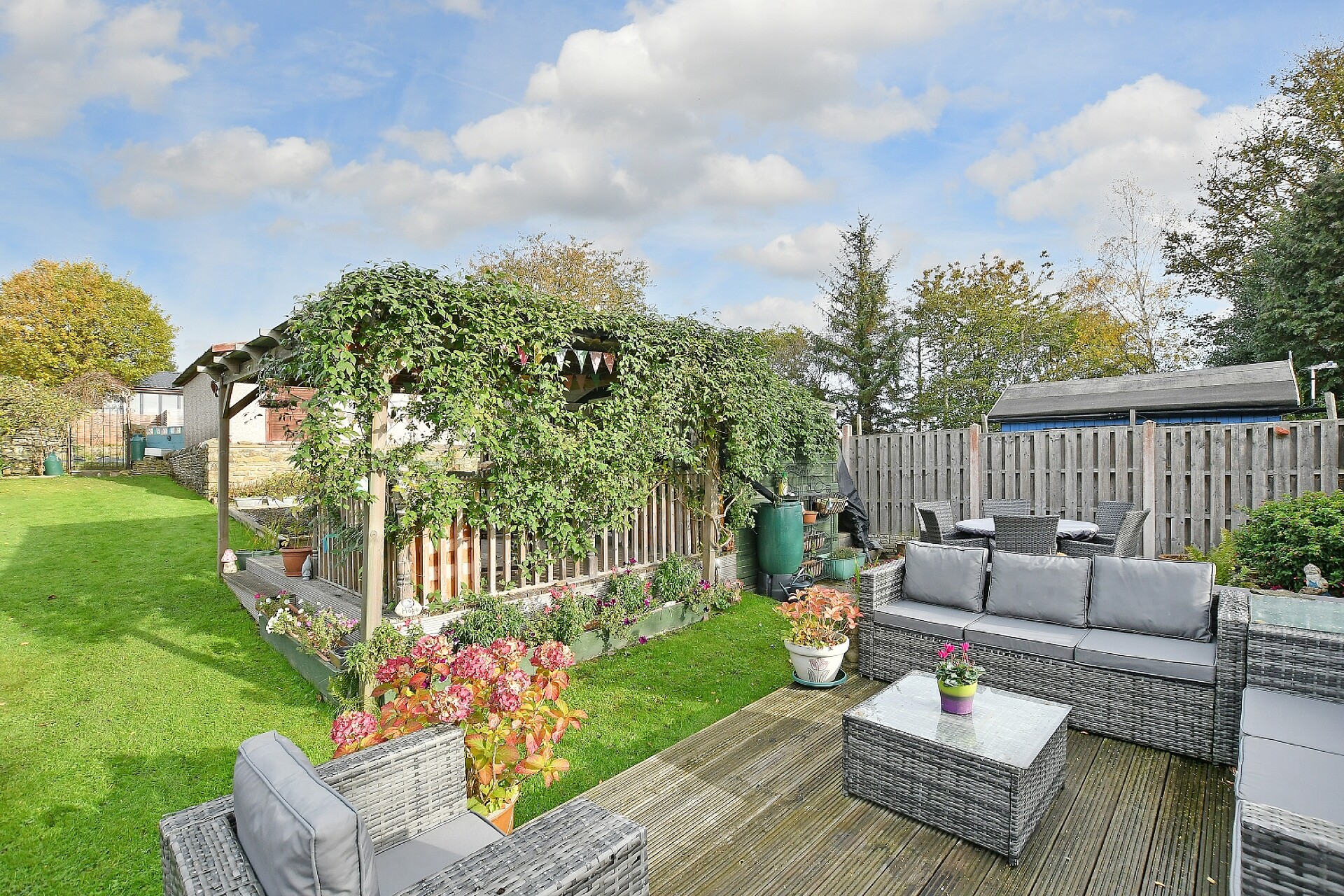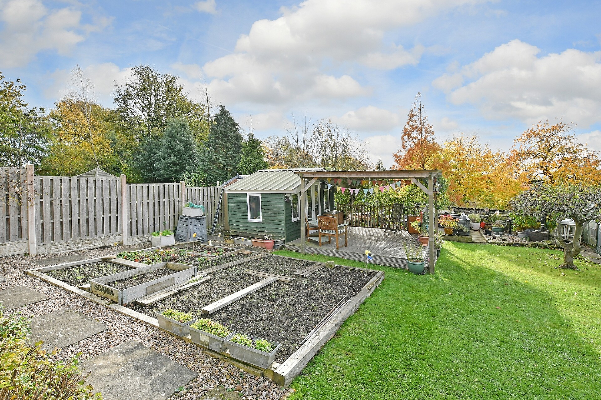 The property also includes a concrete sectional double garage with electric door and a large, private rear garden, beautifully landscaped with a lawn, summerhouse, decked entertaining terrace, three sheds, a vegetable area, and established fruit trees, bushes, and flowering plants.
