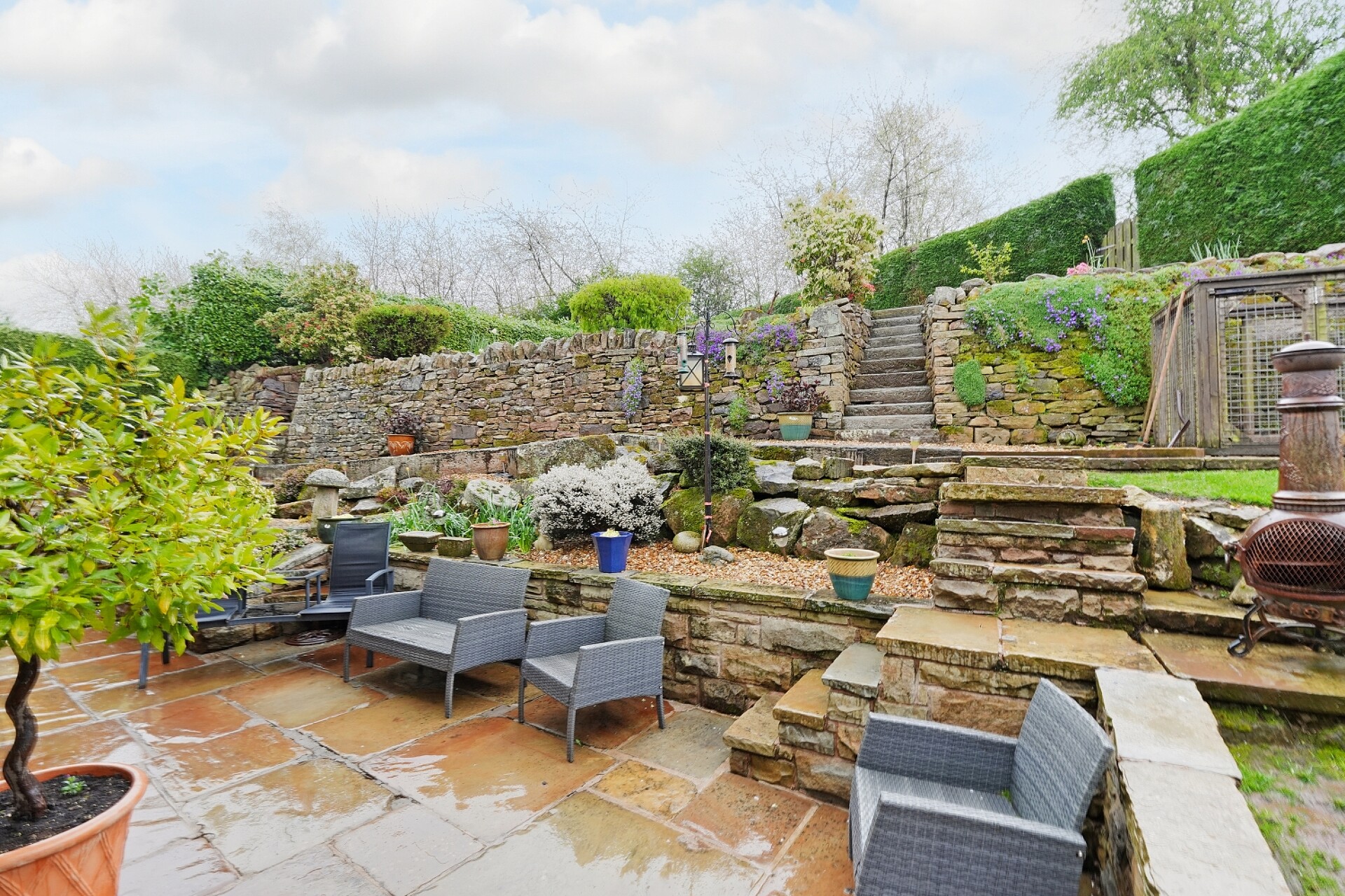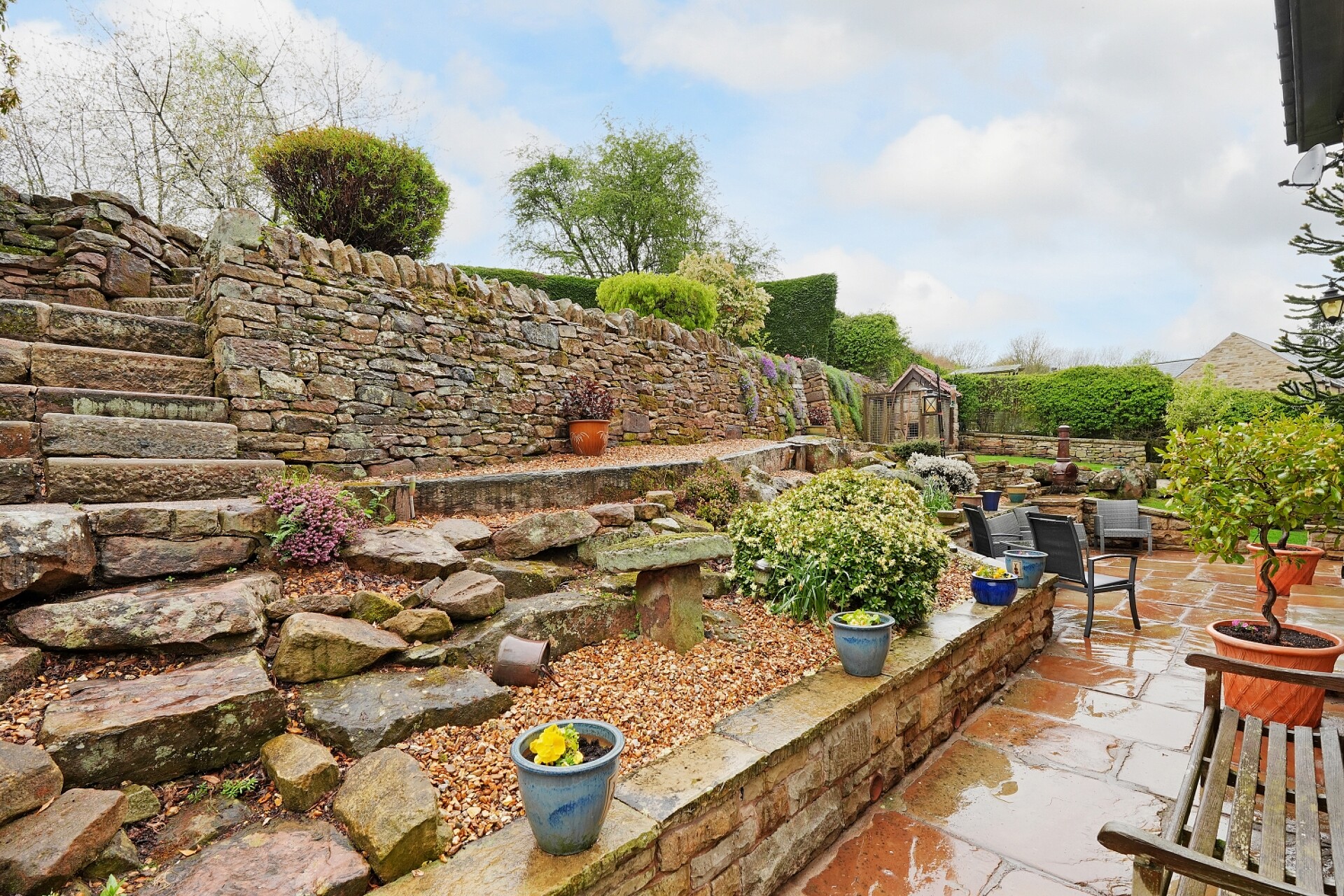 The enclosed gardens have been thoughtfully arranged for ease of maintenance and enjoyment throughout the seasons, with a patio area and several seating spaces positioned to take advantage of sunlight at different times of day. A generous garage together with an attached stone store provides valuable additional storage.