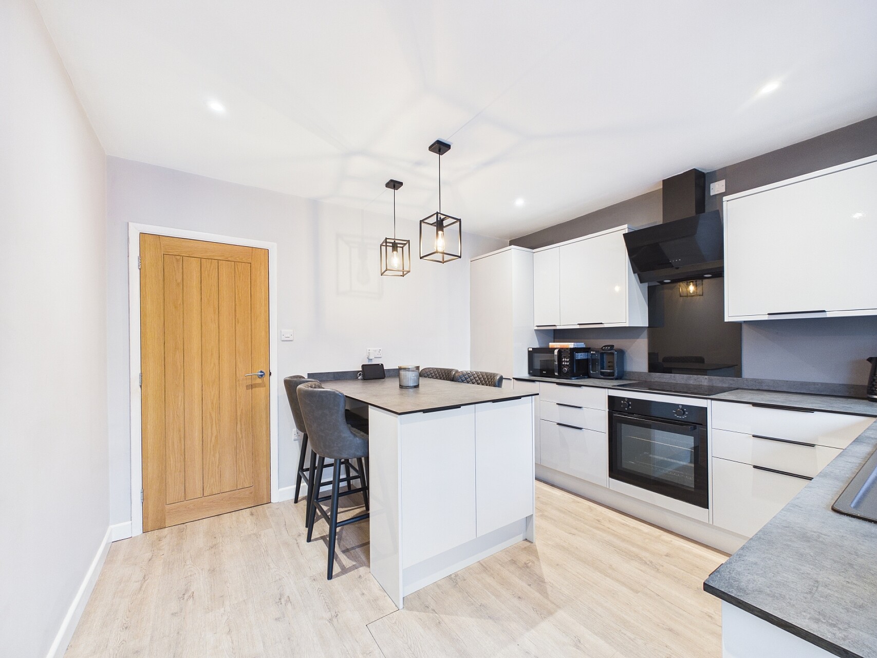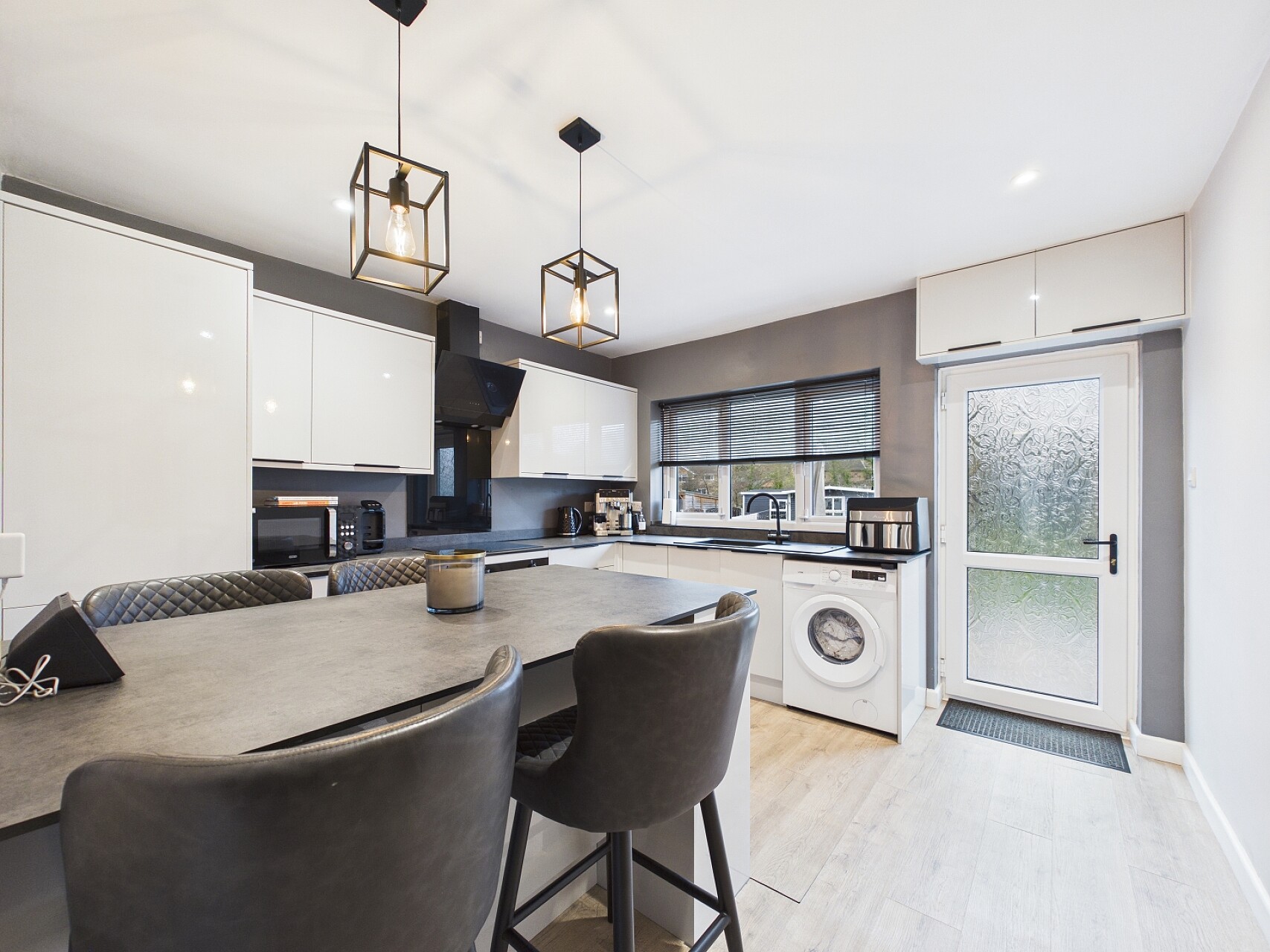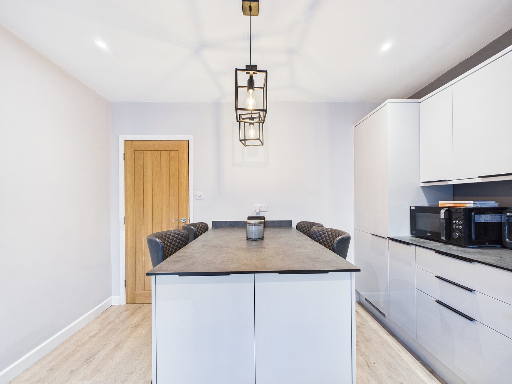 To the rear, the modern dining kitchen is fitted with contemporary units and integrated appliances, centred around a large four-seater breakfast bar island, creating a sociable hub for everyday family life and entertaining.
