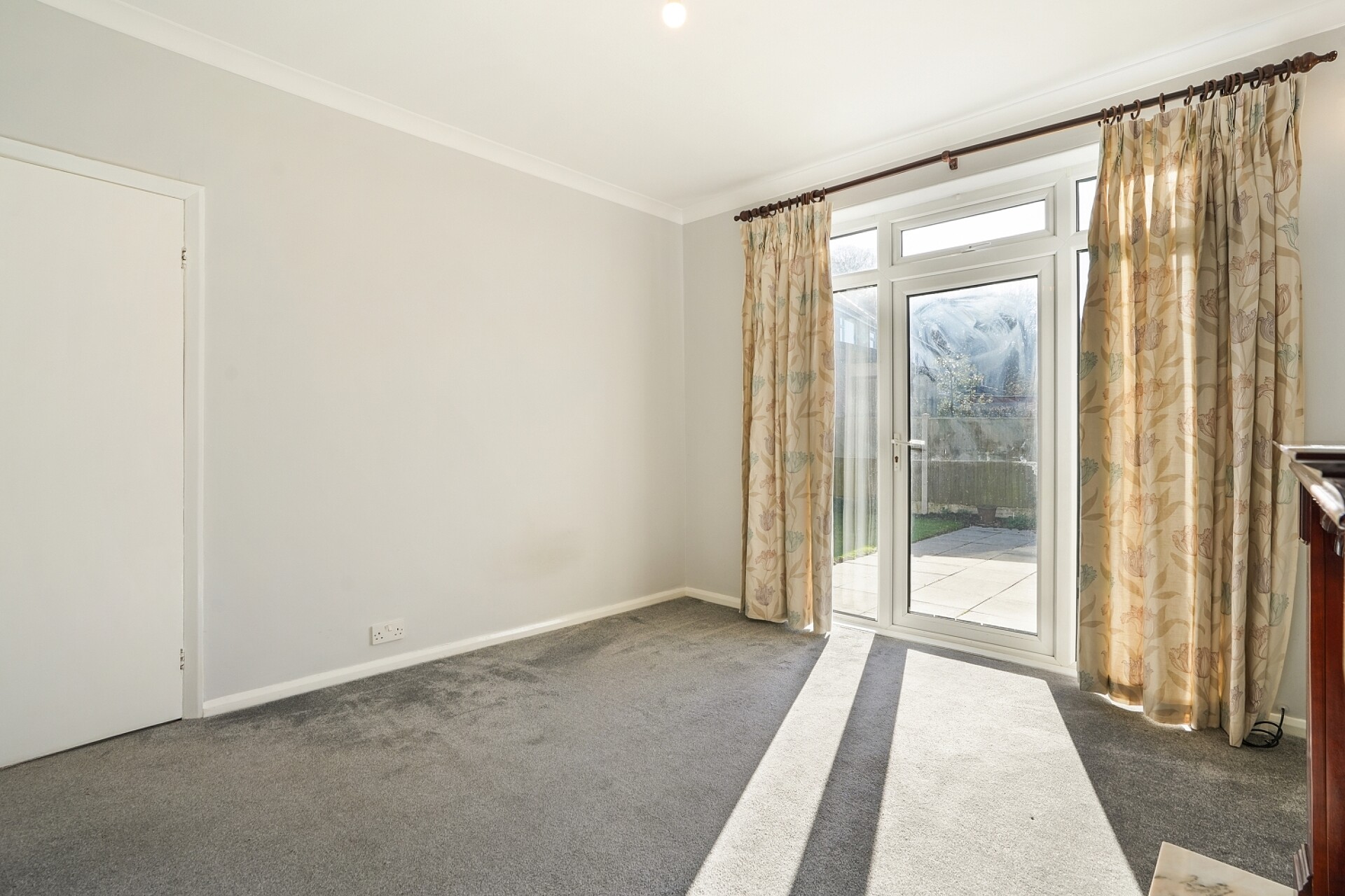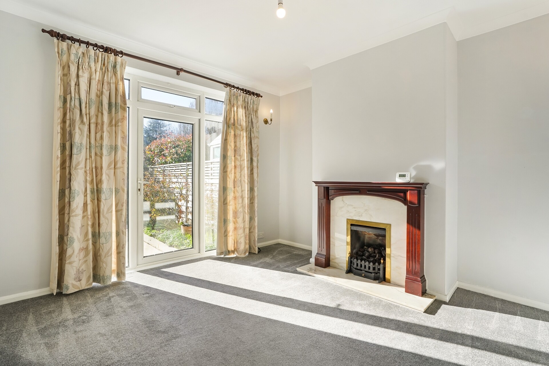 To the rear is a bright and airy lounge creating a relaxing living space, complete with a feature fireplace and patio doors opening directly onto the garden.