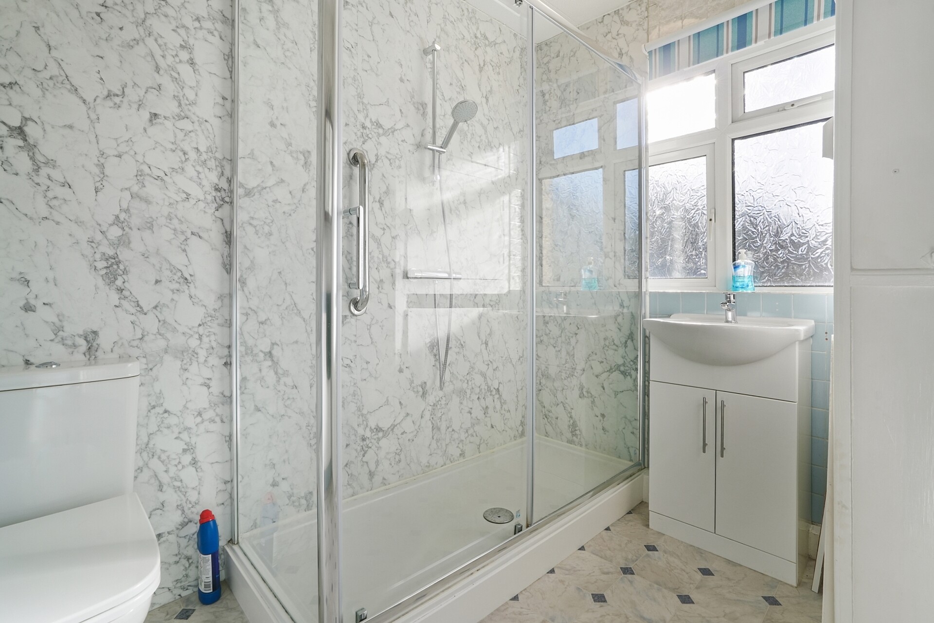 The bathroom is fitted with a large walk-in shower, low flush WC and vanity basin in white, with natural light provided via an obscure glazed window.