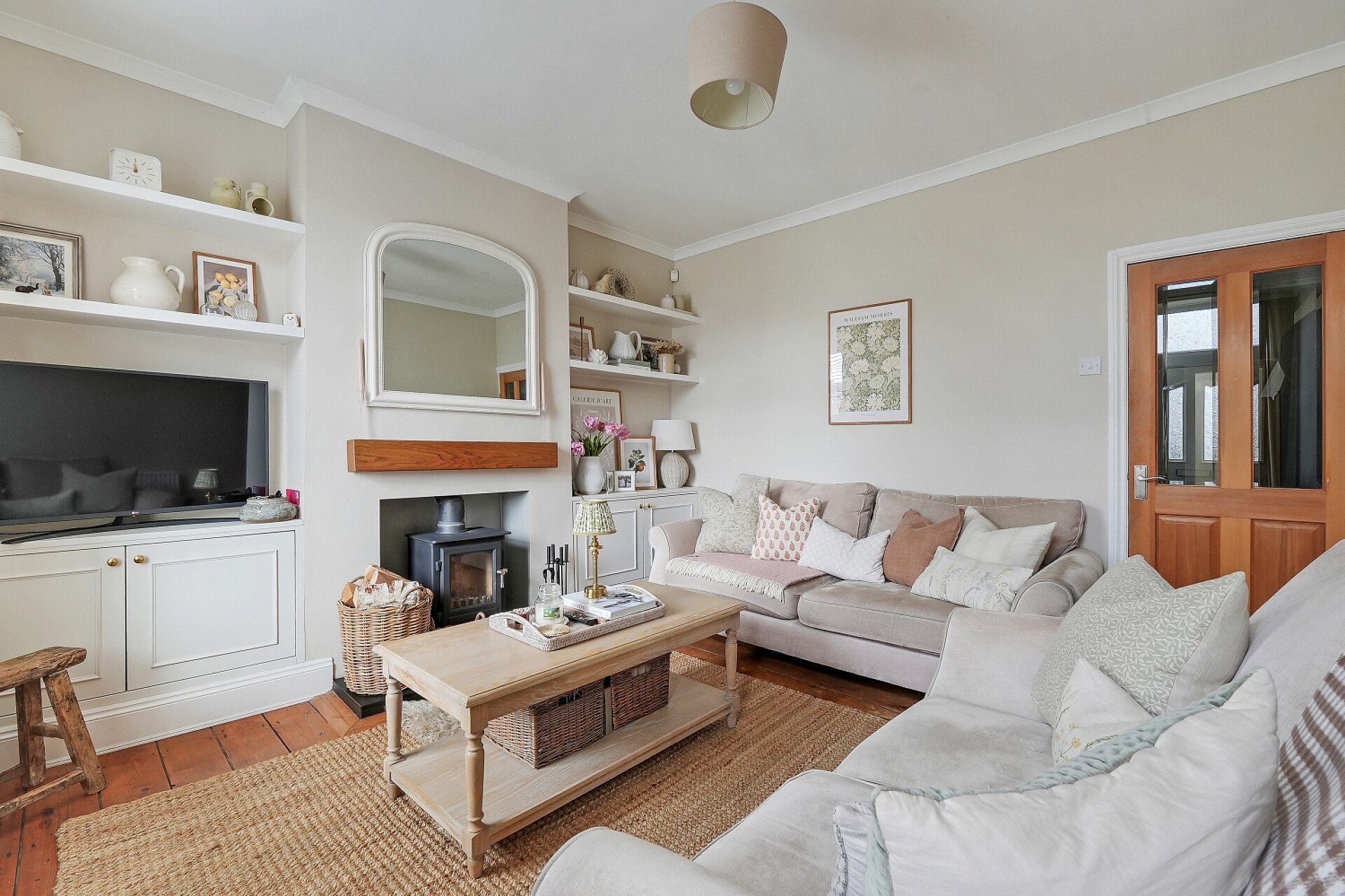A welcoming front-facing reception room featuring an attractive wood floor, front-facing window and entrance door, and a charming wood-burning stove set on a slate hearth, creating a warm and characterful focal point.