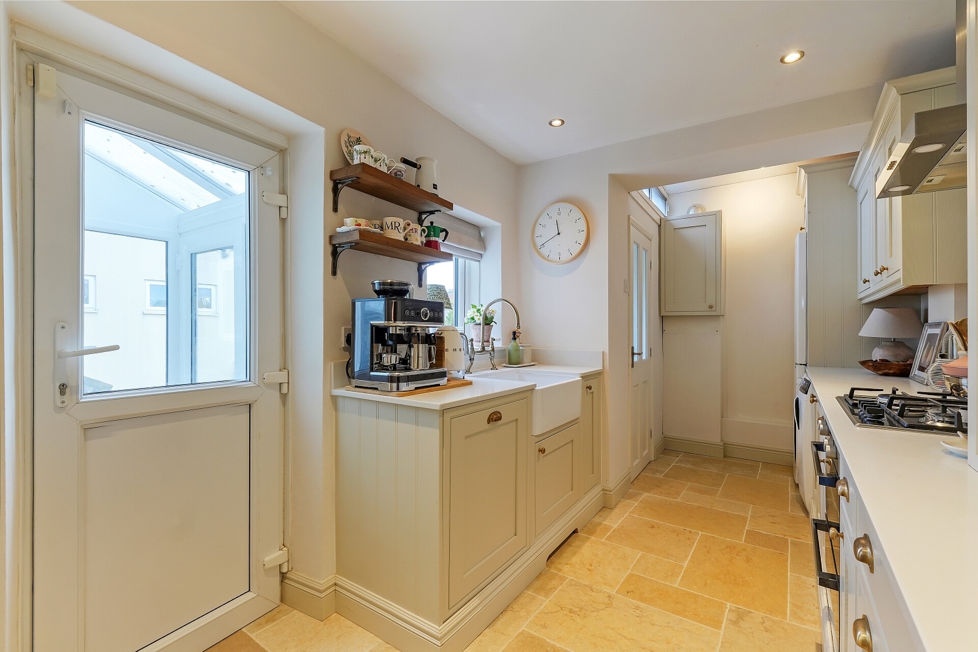 A fabulous kitchen fitted with a range of attractive wall and base units, complemented by Quartz worktops and a Belfast sink. Integrated appliances include a stainless steel hob and oven and dishwasher, along with plumbing and space for a washing machine and space for a fridge freezer. The room benefits from a side-facing window and door.