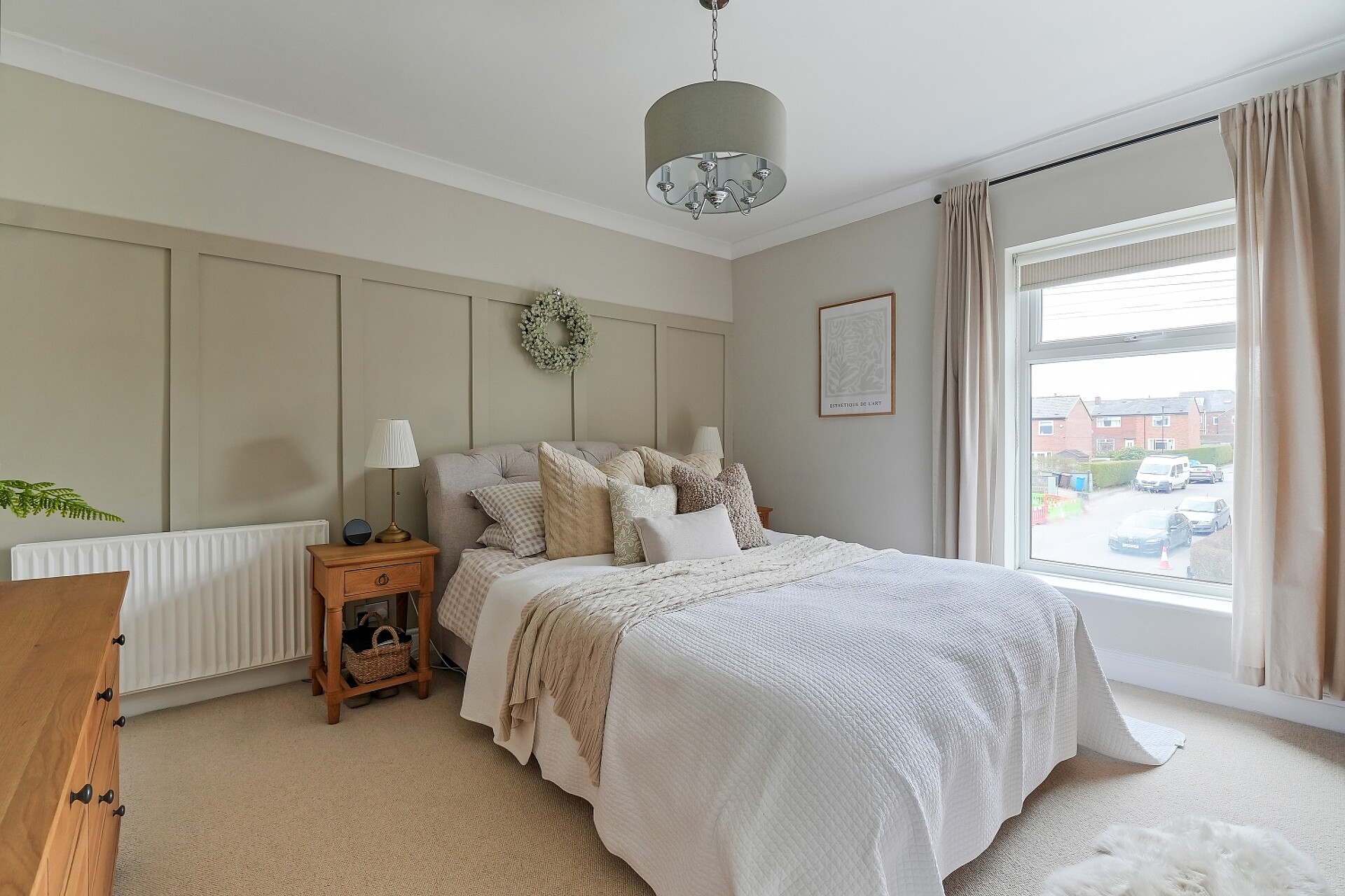 A generous double bedroom with an attractive panelled feature wall, built-in cupboard, and front-facing window enjoying pleasant views down the street.