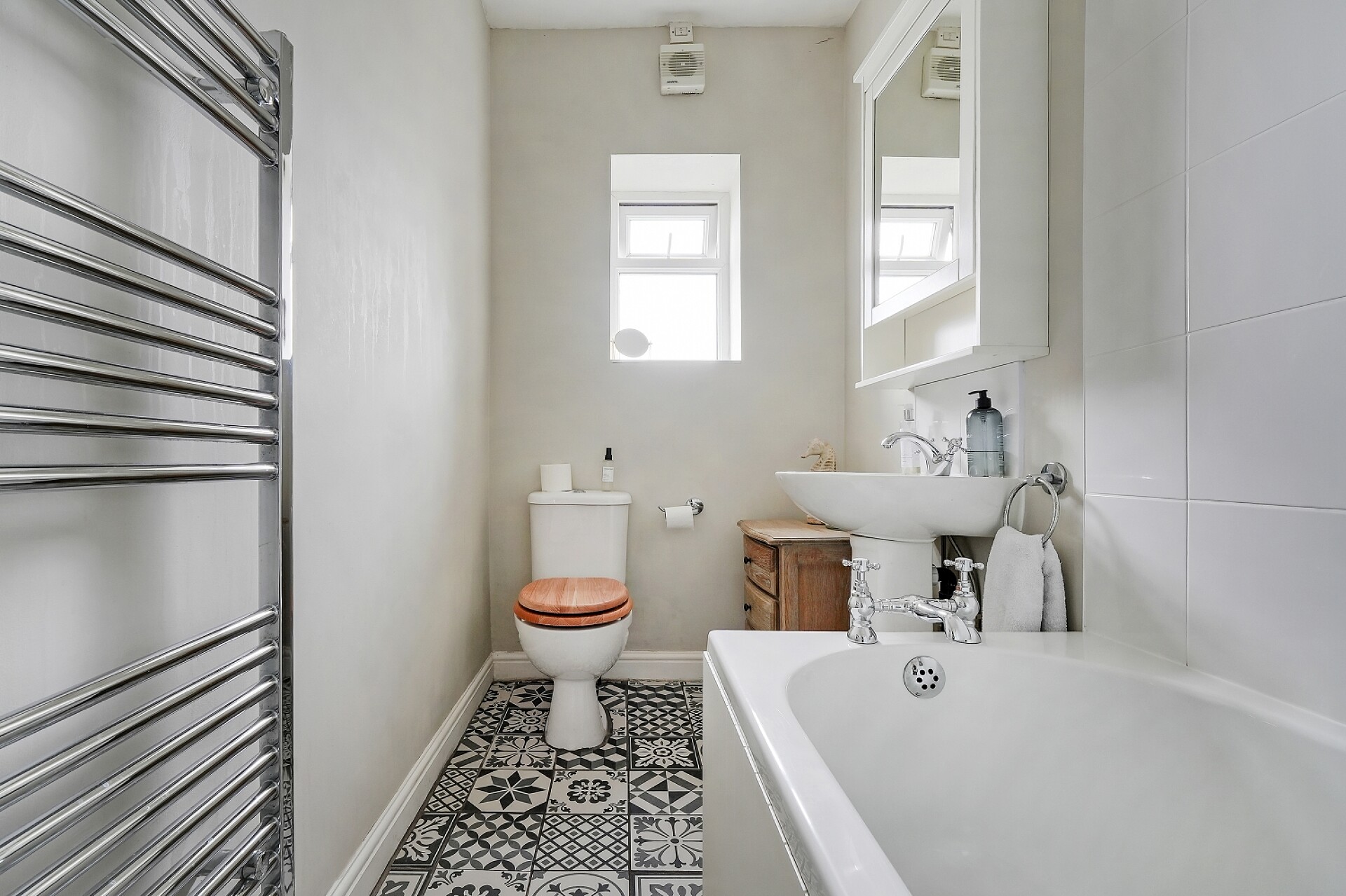 Fitted with a white suite comprising low flush WC, pedestal wash hand basin, and bath with shower over, along with a rear-facing window.
