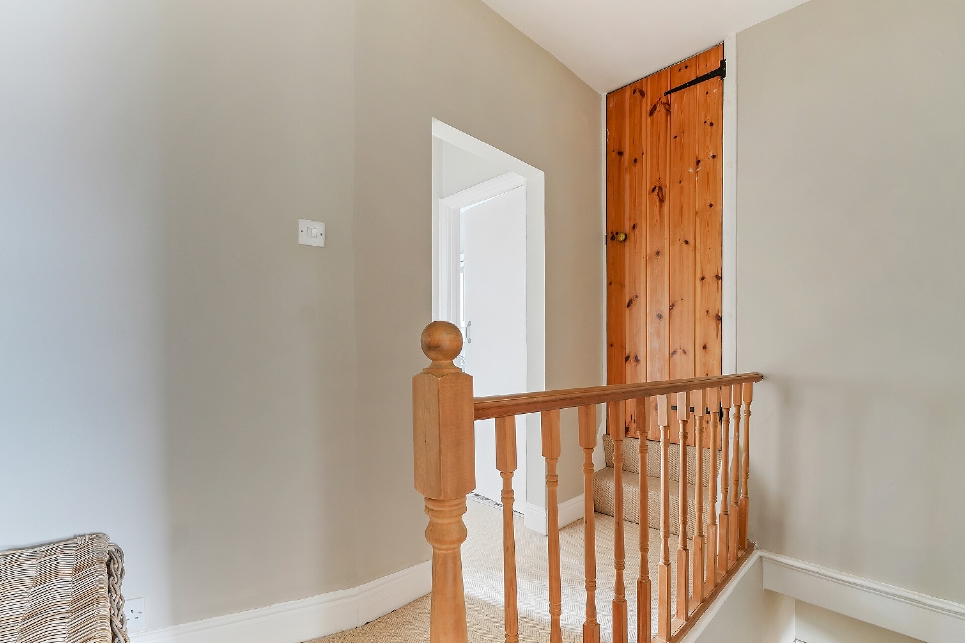A spacious landing provides access to two bedrooms, the bathroom, and stairs leading to the second floor.