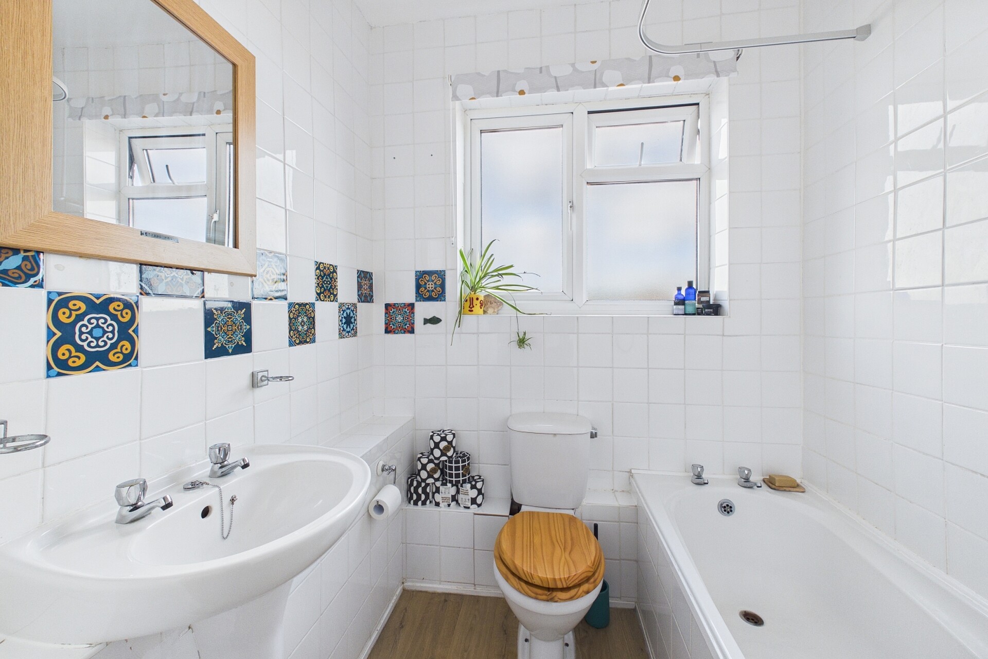 The bathroom is fully tiled and comprises a white suite of bath with shower, pedestal sink and low flush WC. Natural light is available from the obscure glazed window. There is also handy storage space with shelved units behind the door.