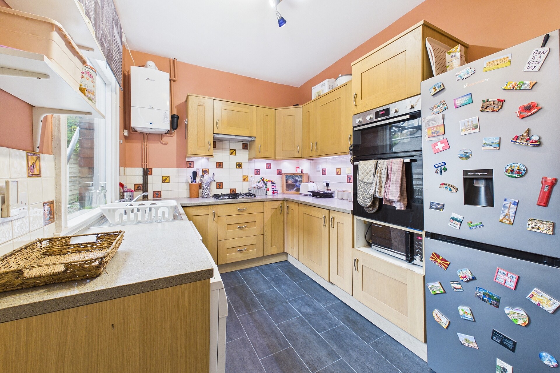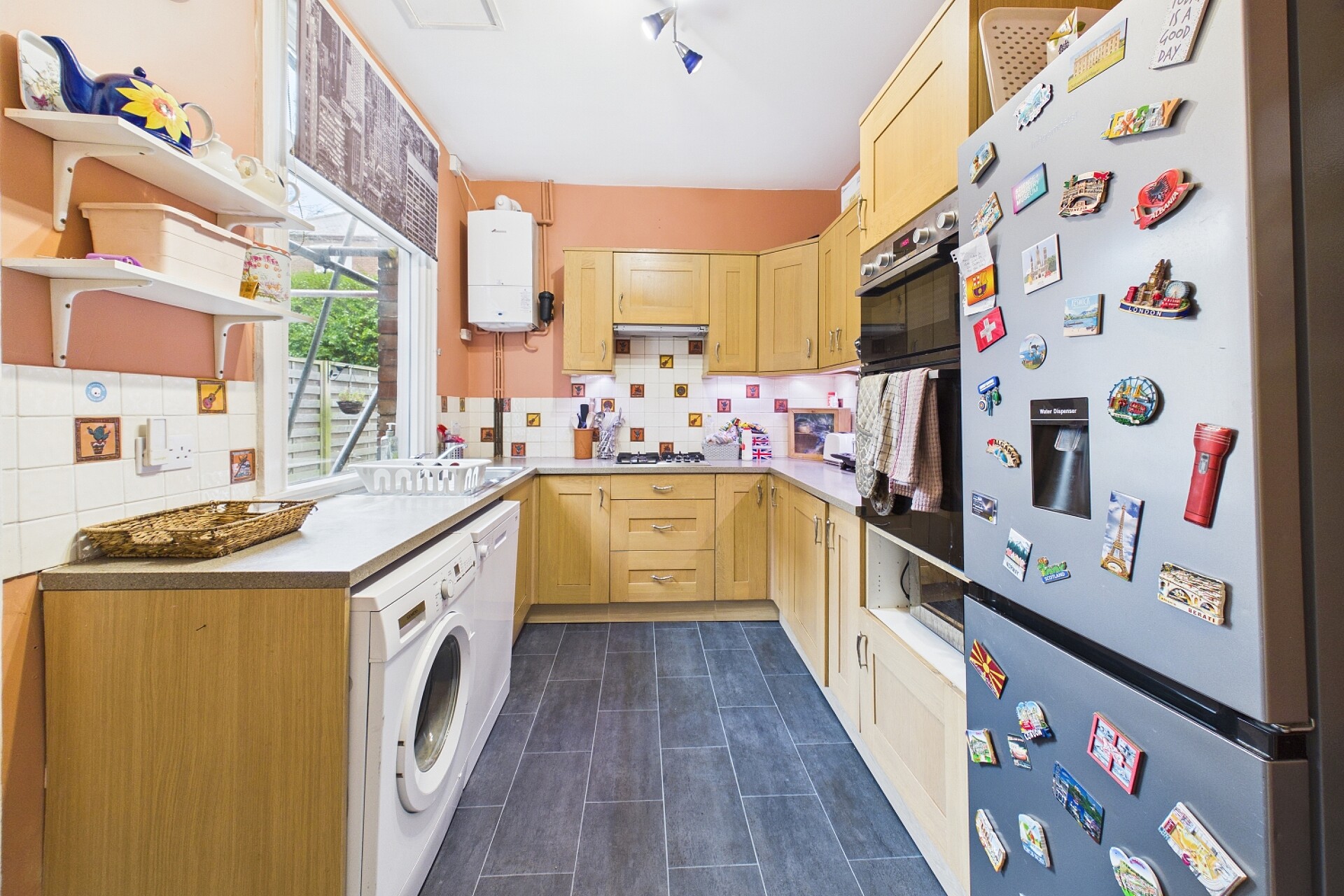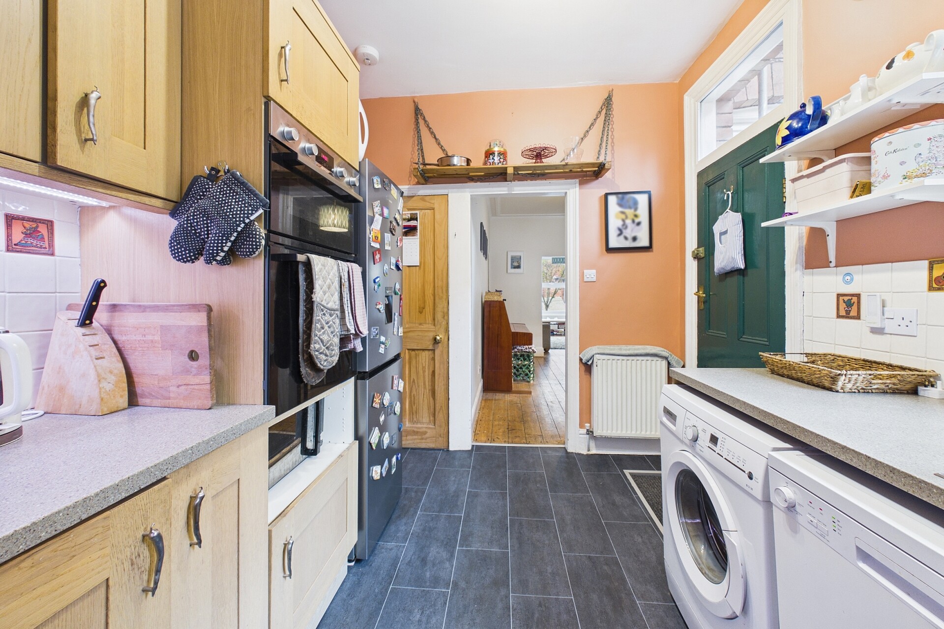 The well-equipped kitchen benefits from an excellent range of fitted wall and base units incorporating a built-in double oven and hob, with space for a fridge freezer and plumbing for both a washing machine and dishwasher. A side-facing window and external entrance door provide additional light and access, with an internal door and steps leading down to the basement level.
