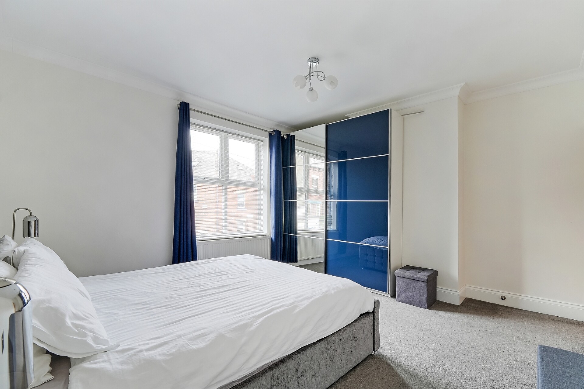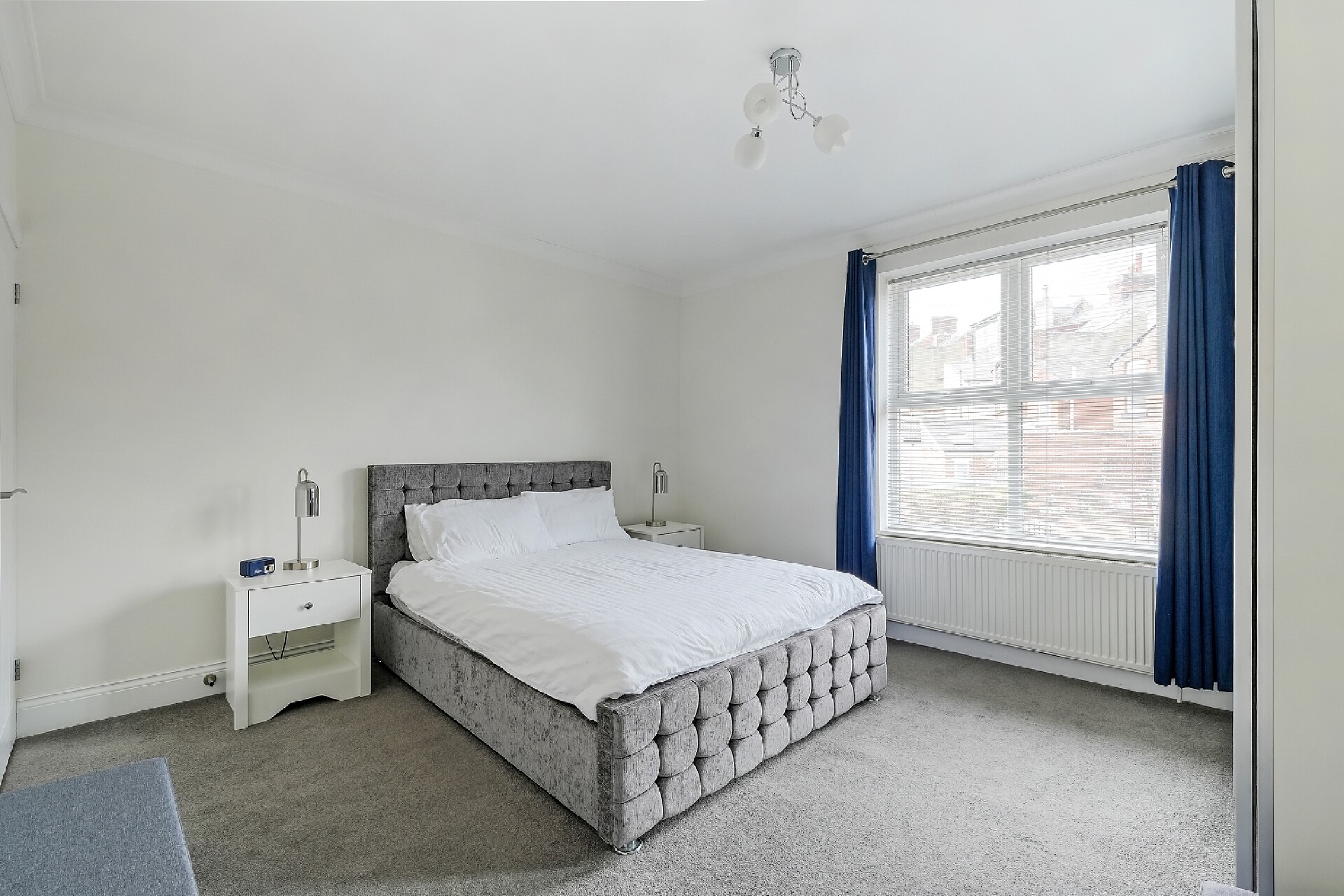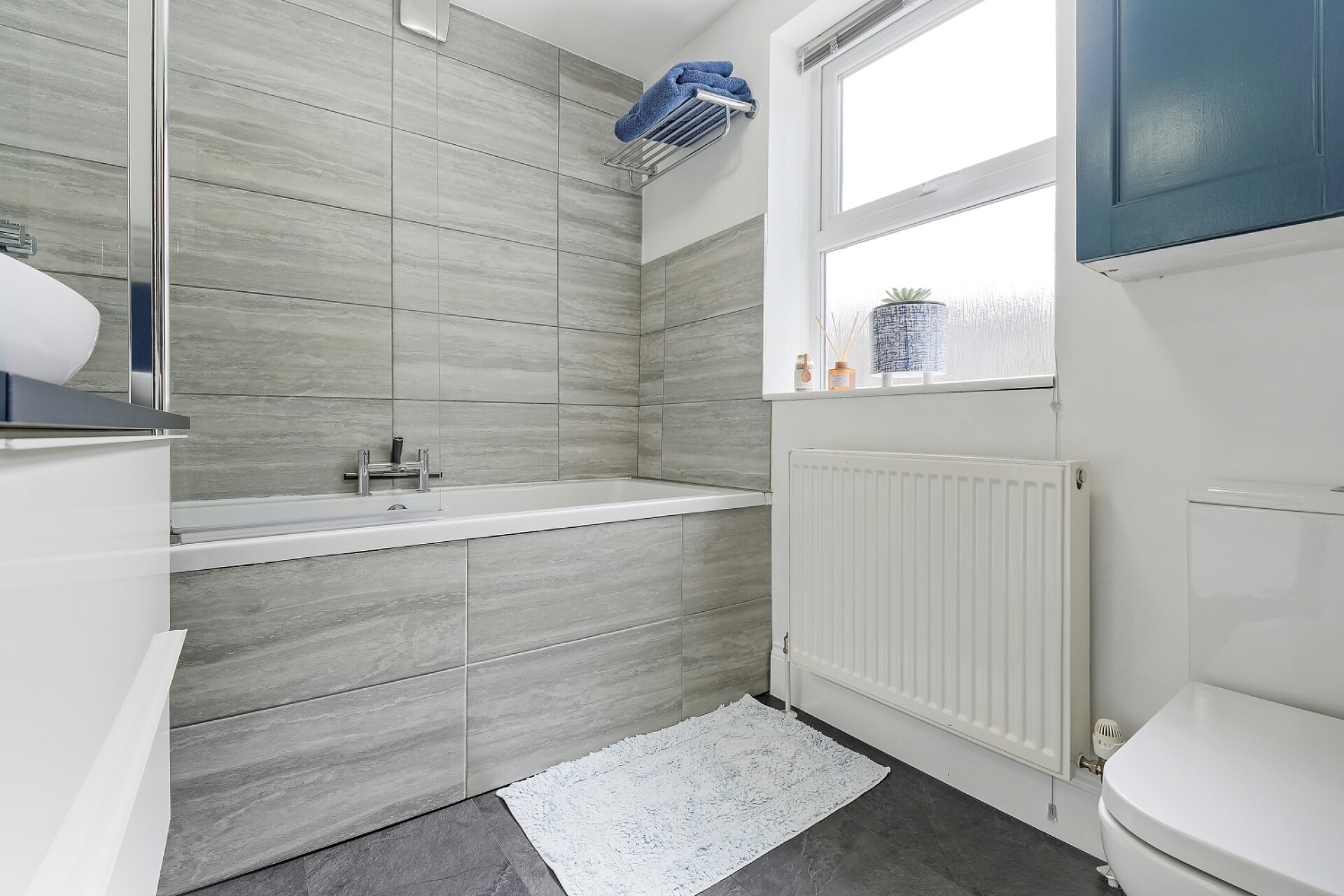 To the first floor is a spacious landing providing access to two well-proportioned double bedrooms and a stylish family bathroom, with a further staircase leading to the second floor. Bedroom Two is a generous double room with a front-facing window, while Bedroom Three is another sizeable double with a rear-facing aspect. The family bathroom is beautifully tiled and fitted with a modern suite comprising a low flush WC, vanity wash hand basin, and bath with shower above and glass shower screen, along with a side-facing window.