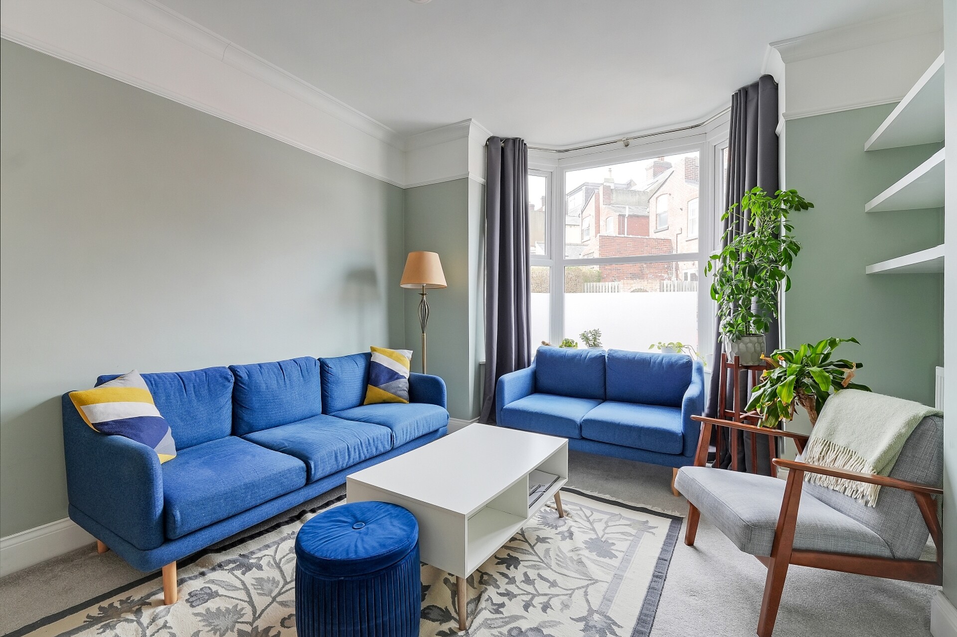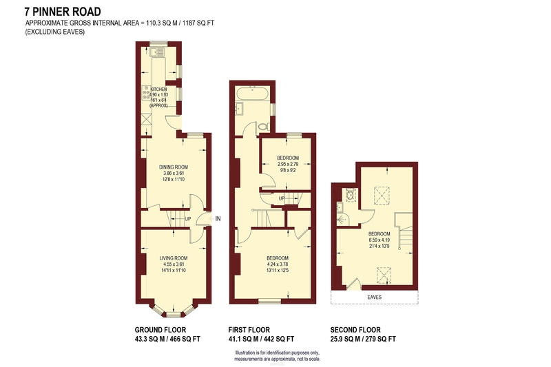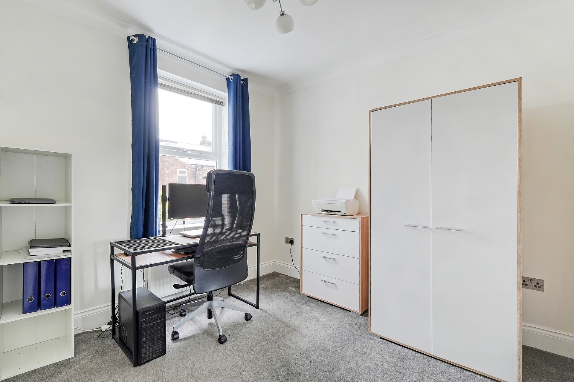 To the first floor is a spacious landing providing access to two well-proportioned double bedrooms and a stylish family bathroom, with a further staircase leading to the second floor. Bedroom Two is a generous double room with a front-facing window, while Bedroom Three is another sizeable double with a rear-facing aspect. The family bathroom is beautifully tiled and fitted with a modern suite comprising a low flush WC, vanity wash hand basin, and bath with shower above and glass shower screen, along with a side-facing window.