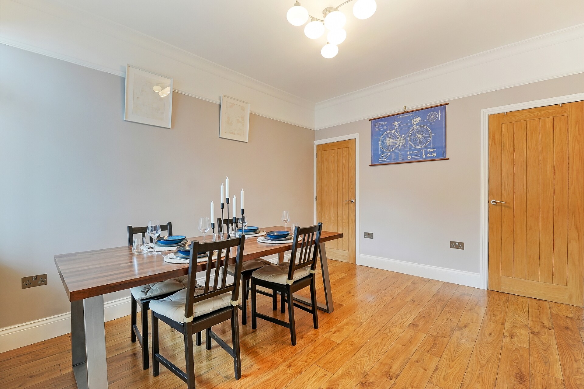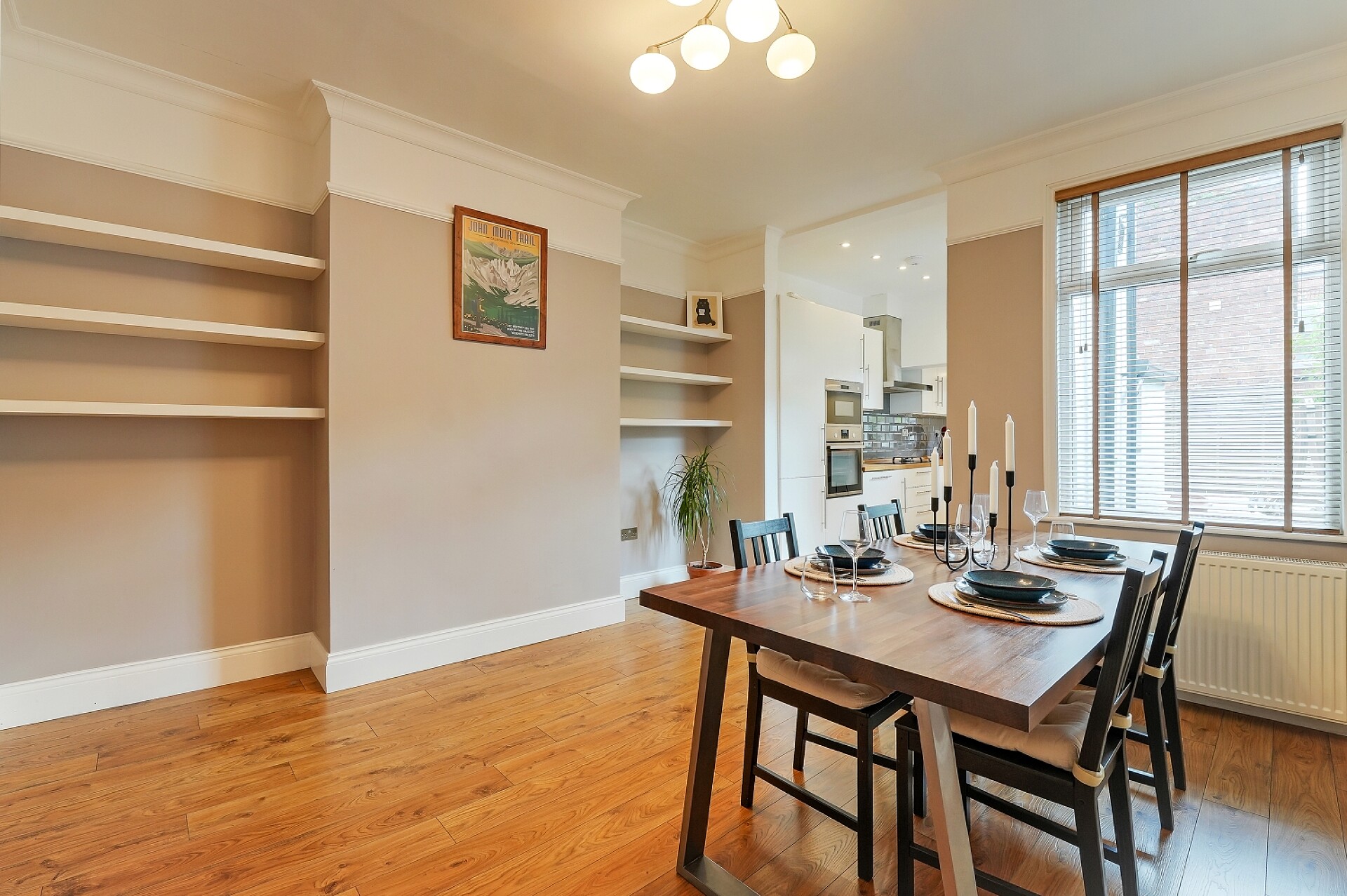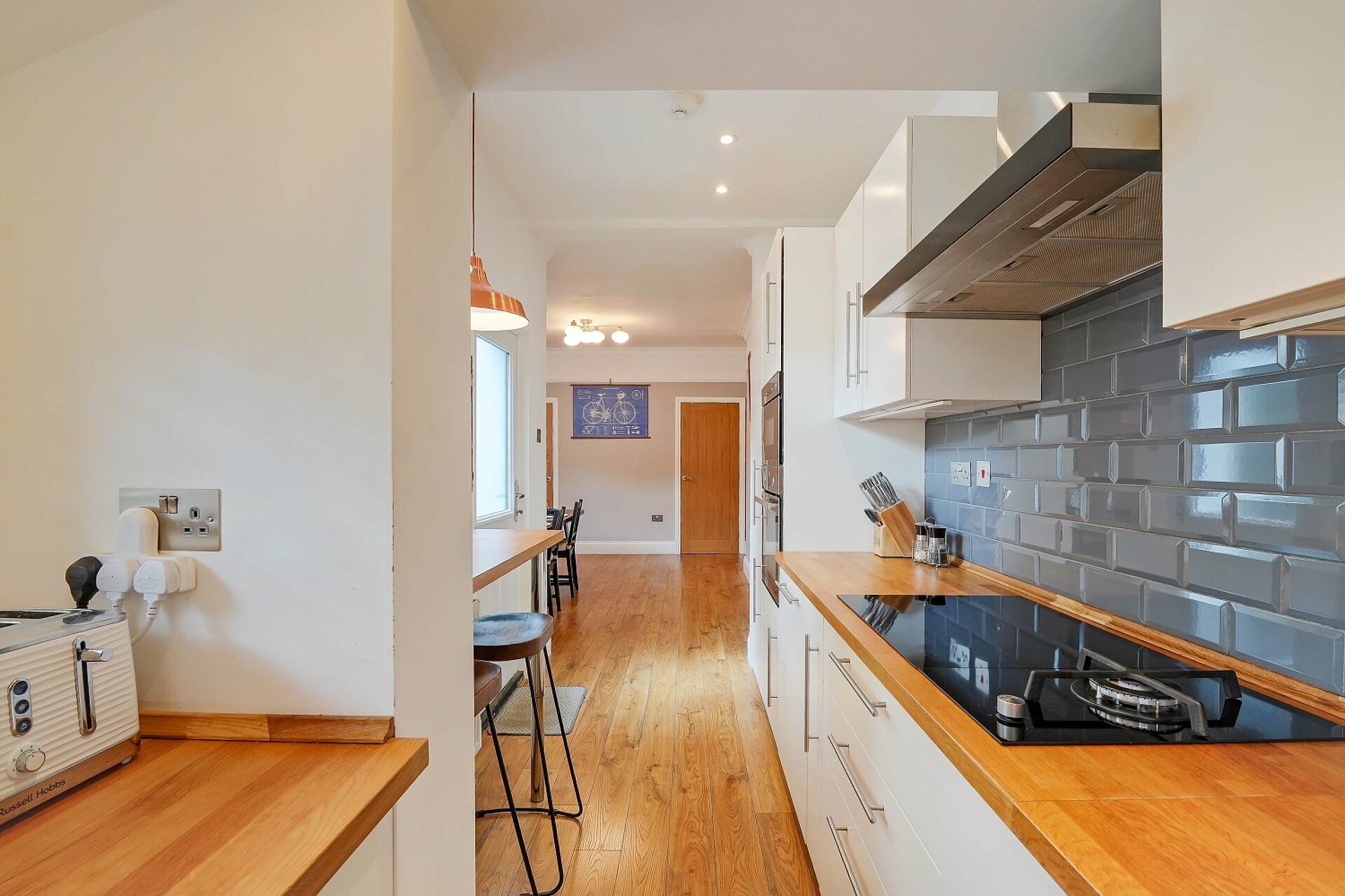 The accommodation briefly comprises: A welcoming entrance hallway with a side-facing entrance door and staircase rising to the first floor. To the front is a generous bay-windowed lounge, while to the rear sits an impressive and spacious dining room featuring beautiful wood effect durable laminate flooring and a rear-facing window. A door with steps provides access to the basement, which offers excellent opportunity for conversion to habitable accommodation (subject to necessary consents) The dining room flows seamlessly into the extended kitchen, which is fitted with a comprehensive range of attractive wall and base units and incorporates a stainless steel built in oven and a built in microwave, induction hob with gas ring and extractor hood, integrated fridge freezer and dishwasher, and space for a washing machine. The kitchen benefits from side and rear-facing windows, a side entrance door leading to the garden, and a striking vaulted ceiling that enhances the sense of space and light.