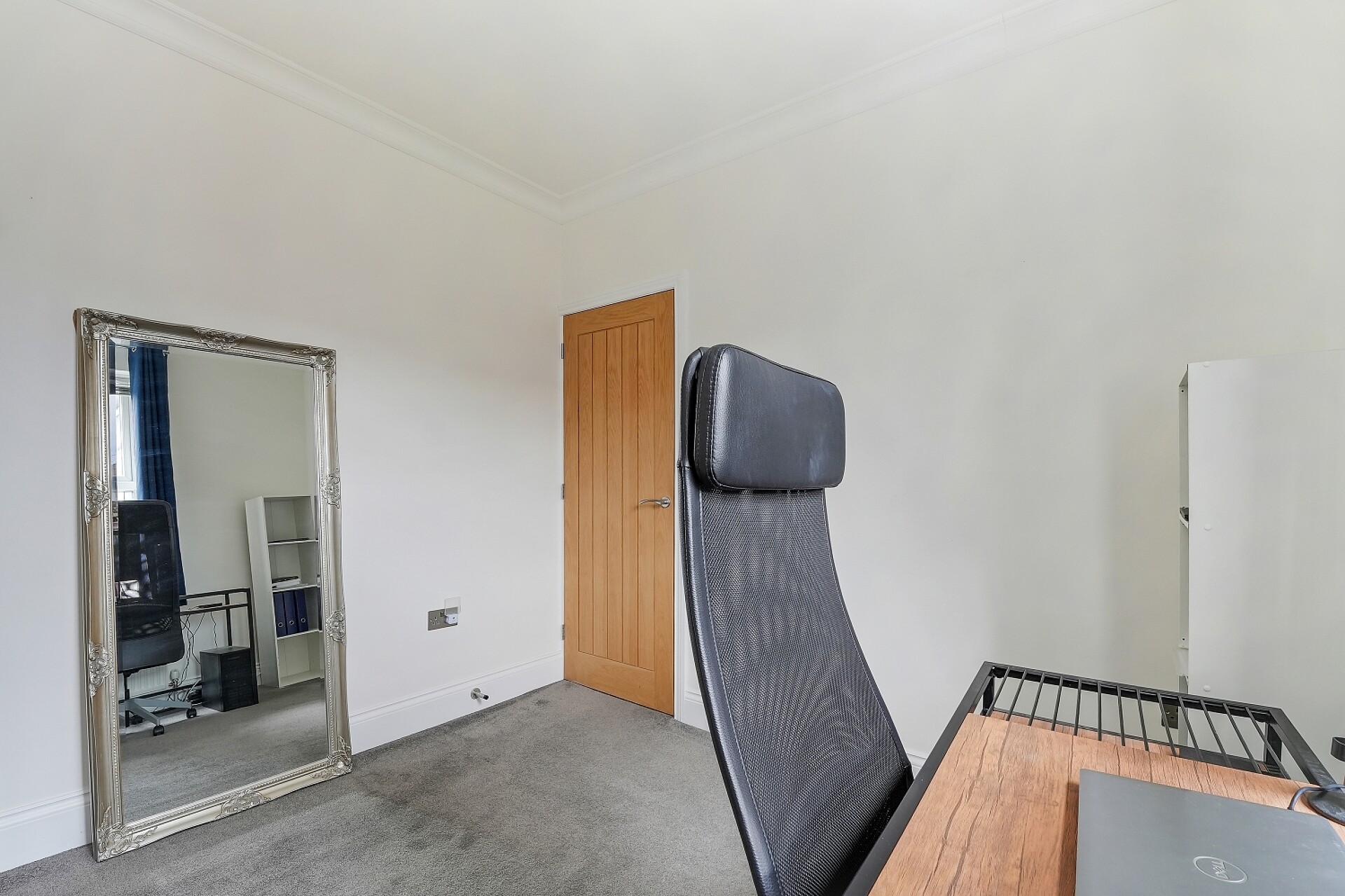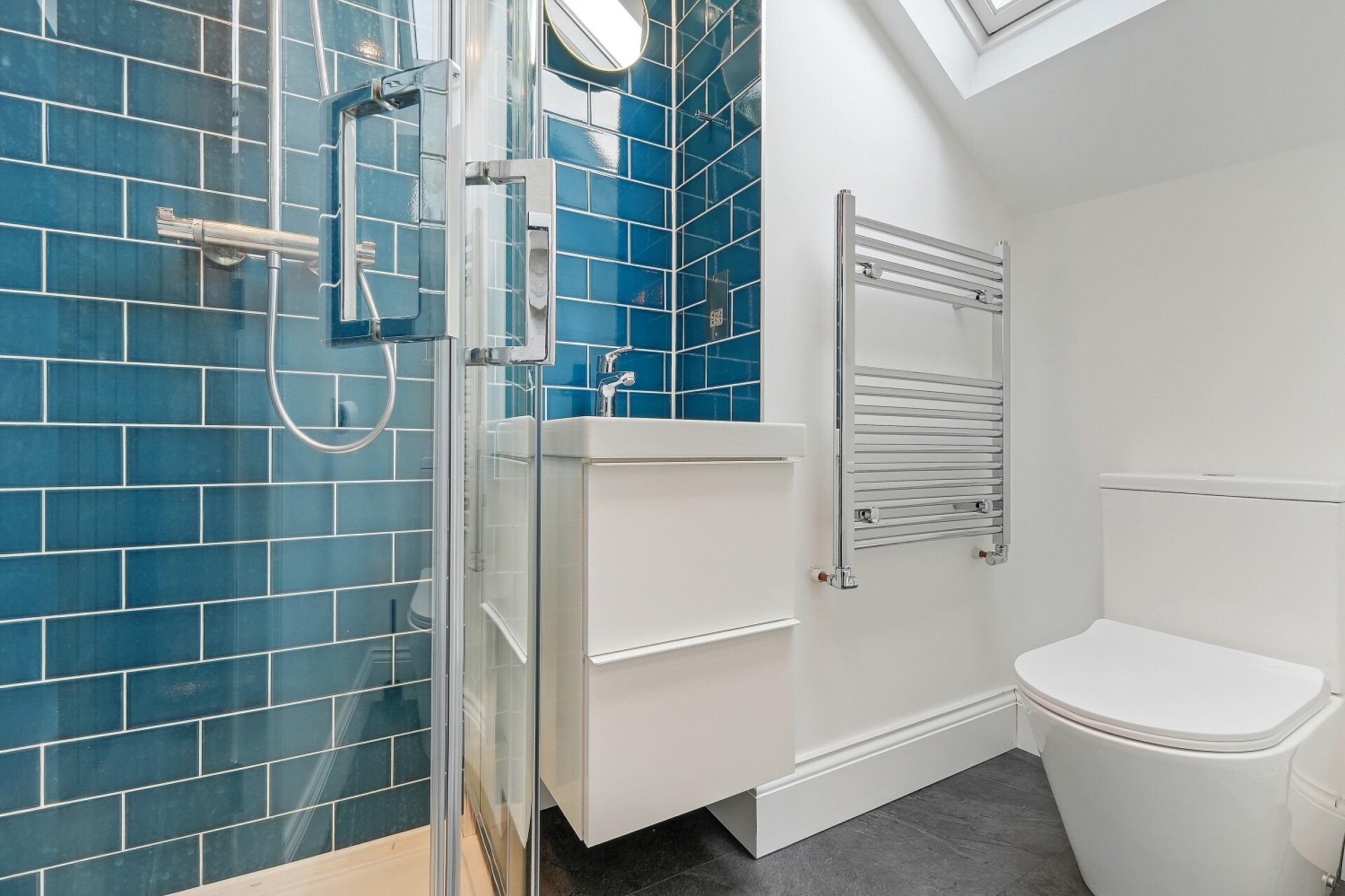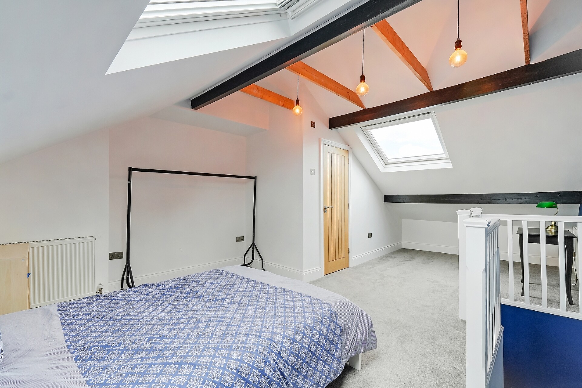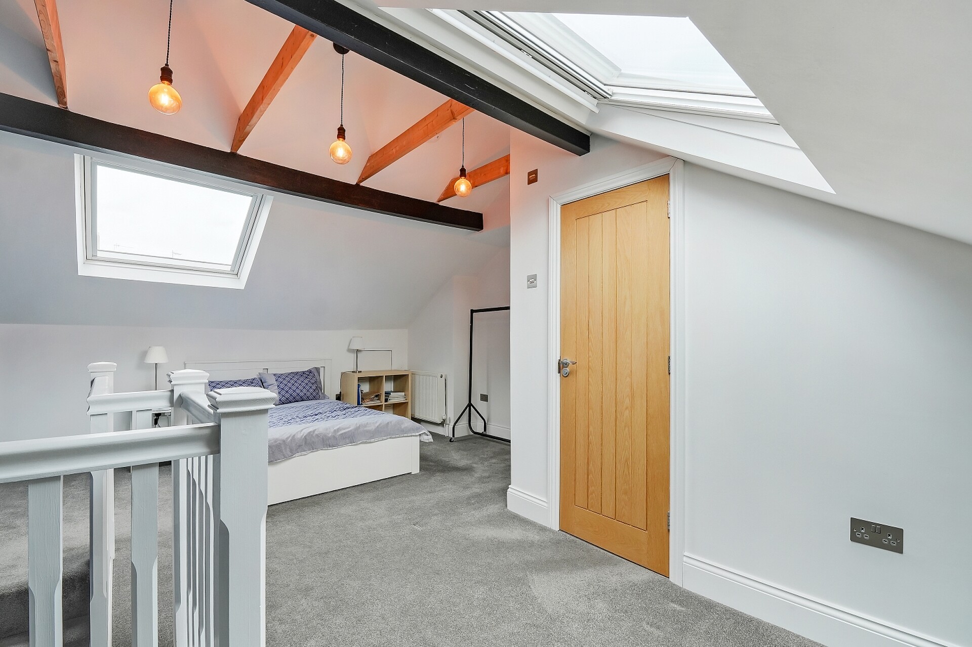 Occupying the entire second floor is the superb Master Bedroom suite, a particularly generous and impressive space featuring front and rear Velux windows that flood the room with natural light. The room also benefits from a contemporary ensuite shower room comprising a low flush WC, vanity wash hand basin, shower cubicle, and Velux window.