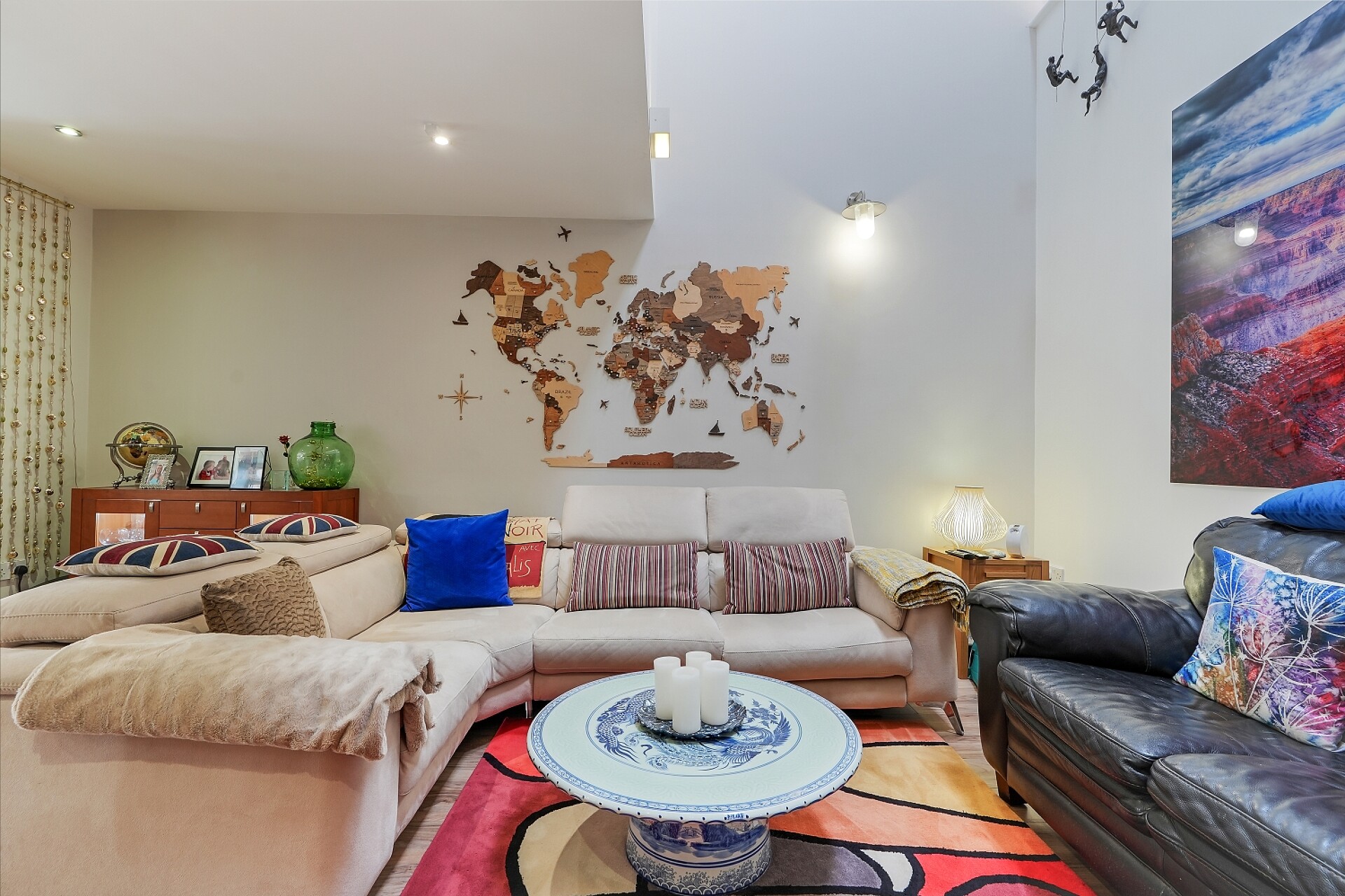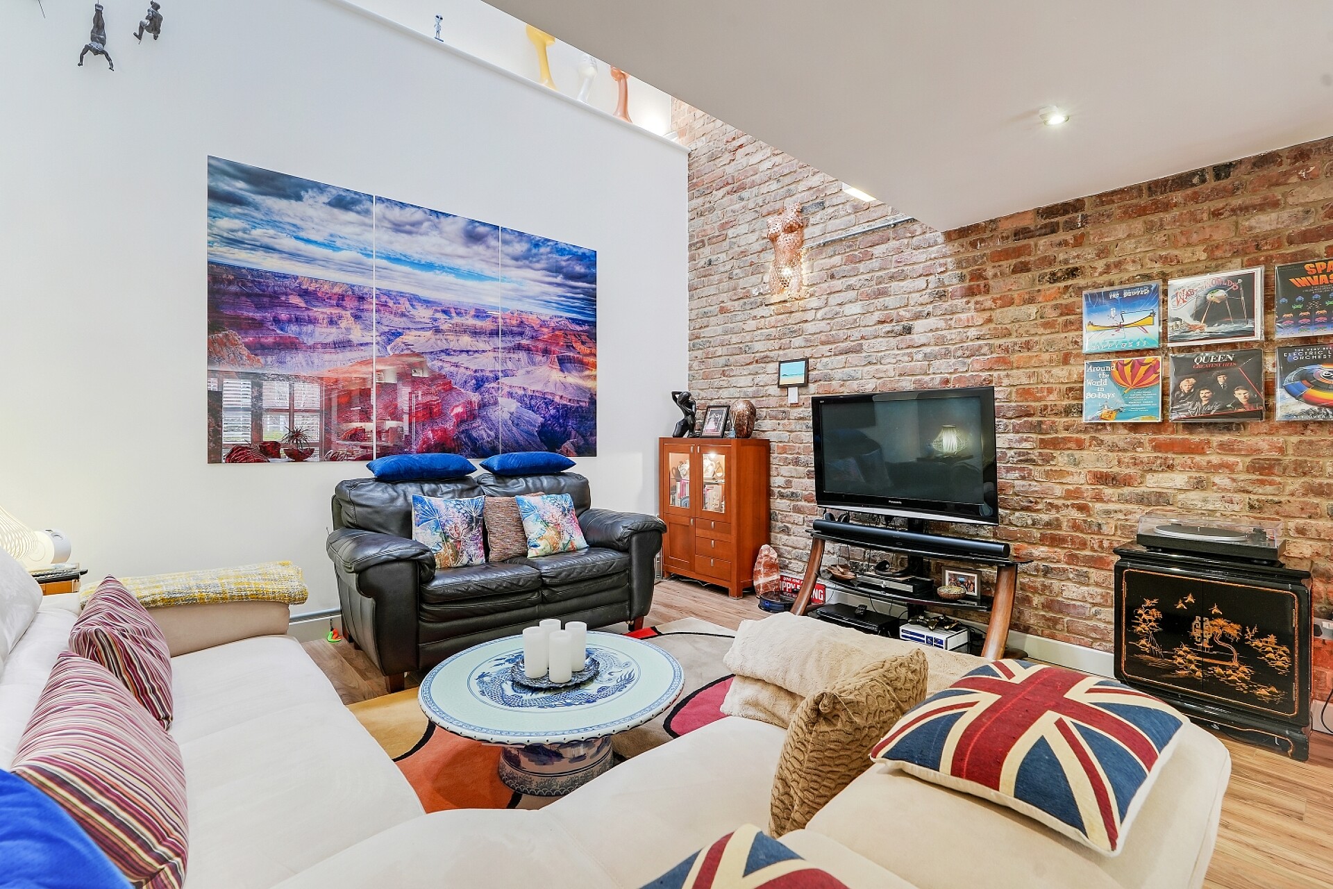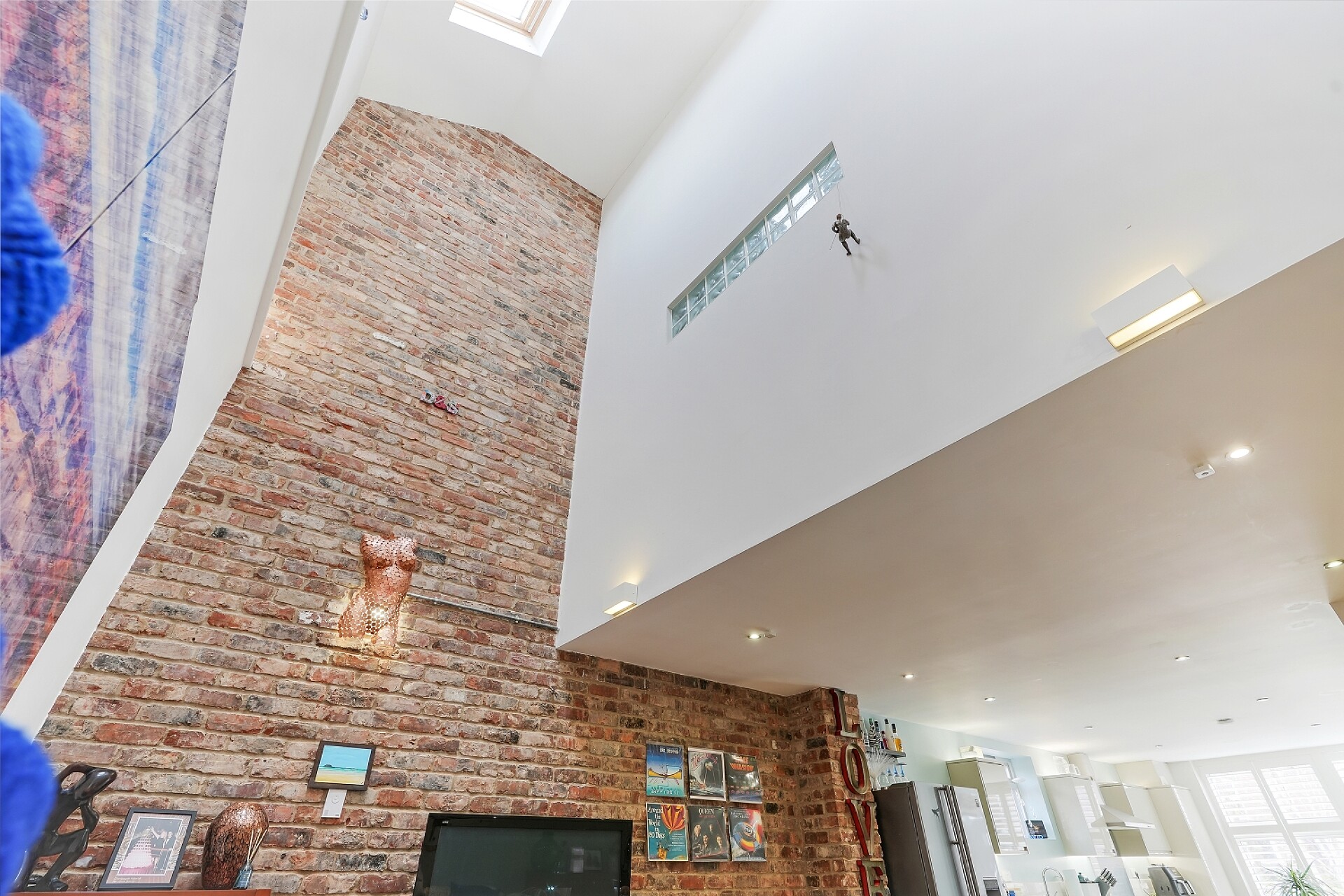 - Fabulous open plan living area with exposed brick feature wall and vaulted ceiling