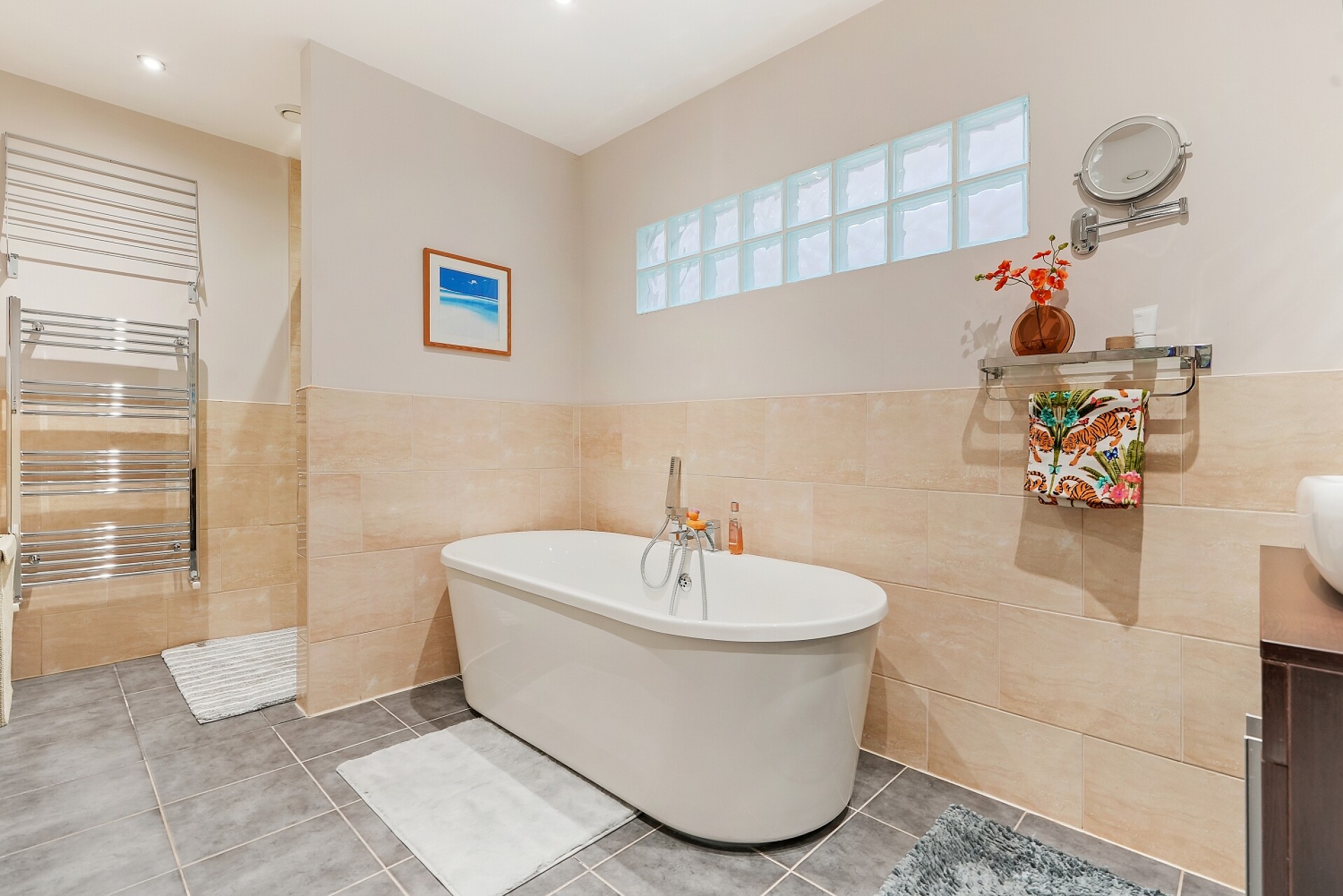 Also on this level is a beautifully appointed family bathroom featuring quality tiling and a stylish suite comprising a low flush WC, vanity wash hand basin, roll-top bath, and separate large walk-in shower.