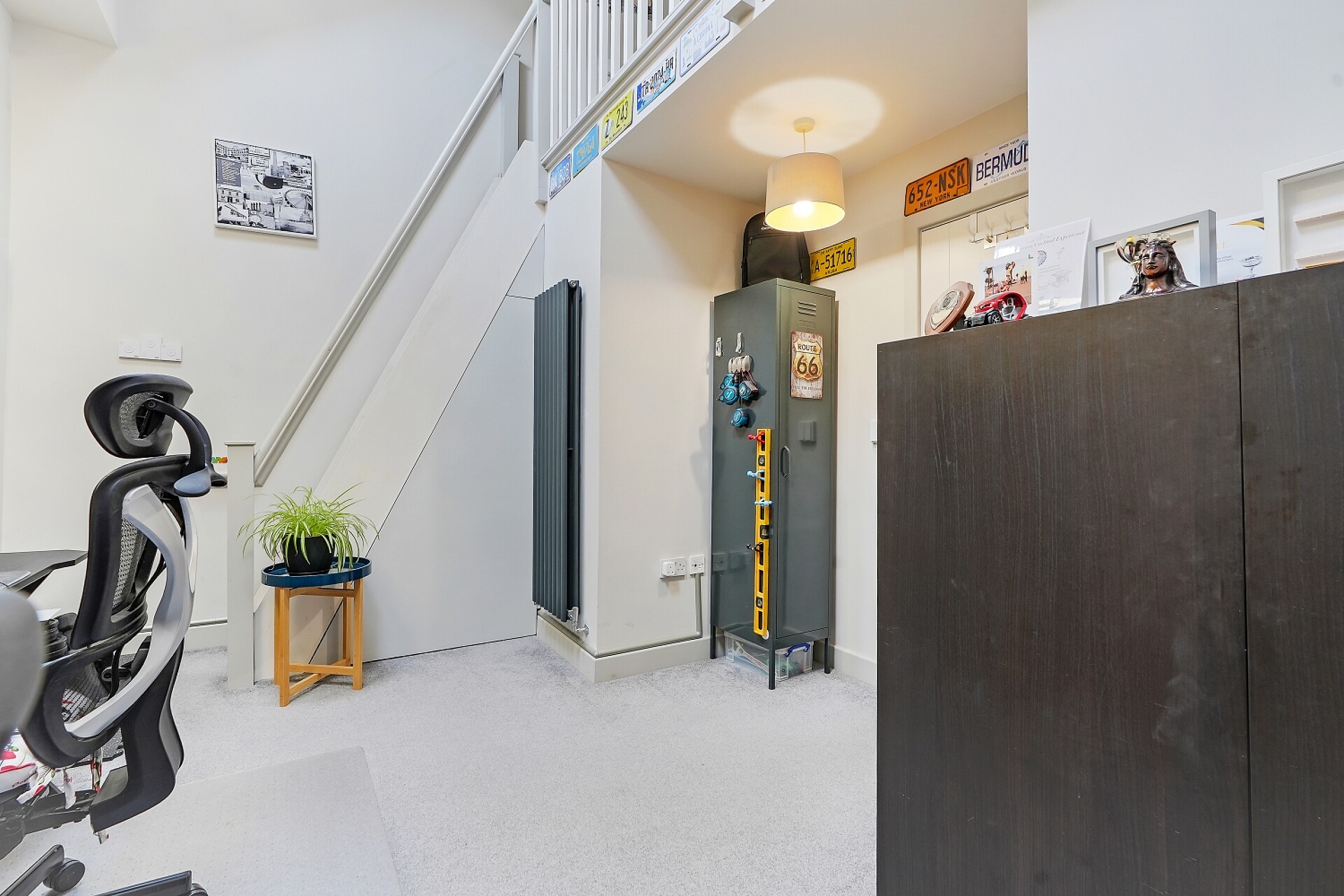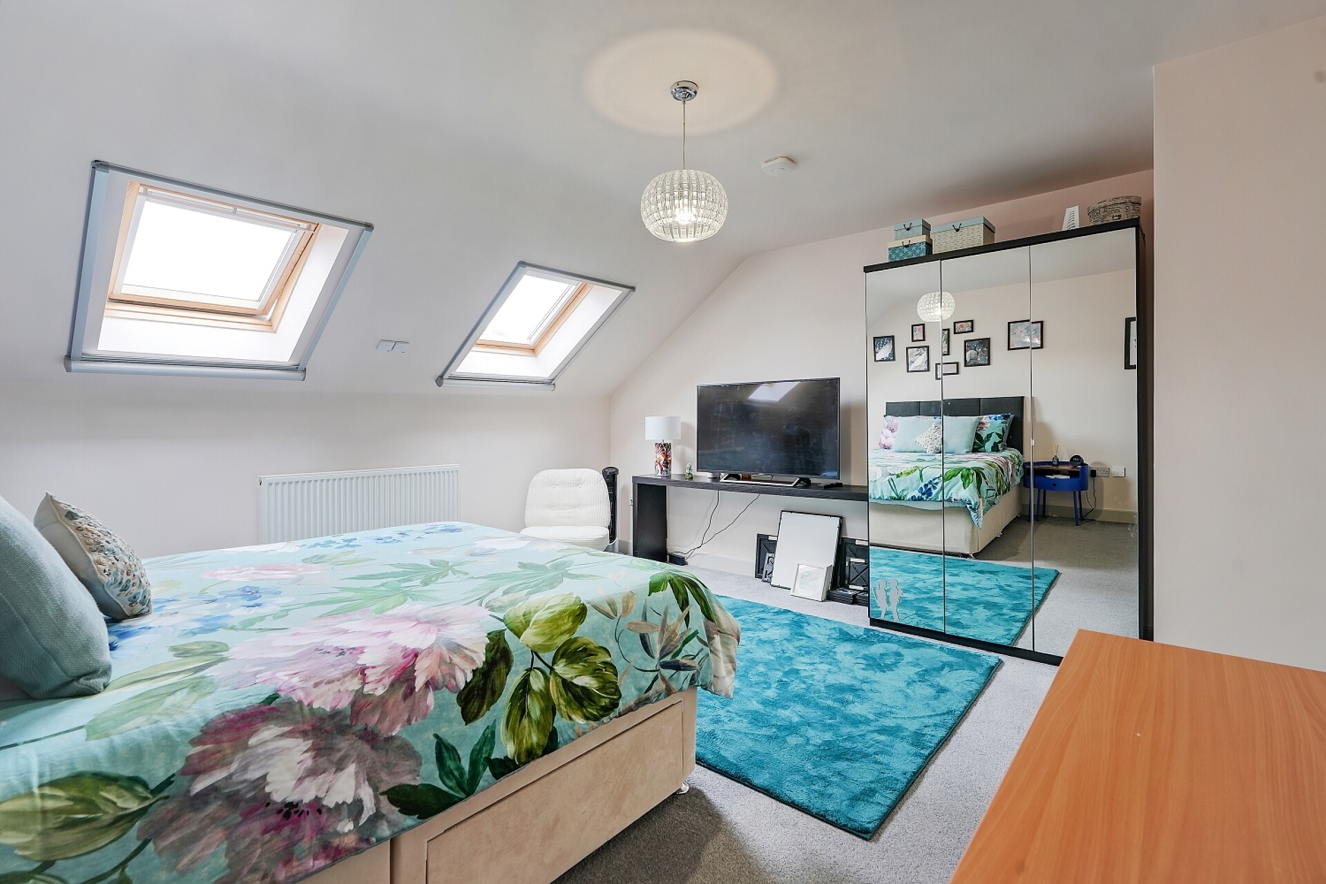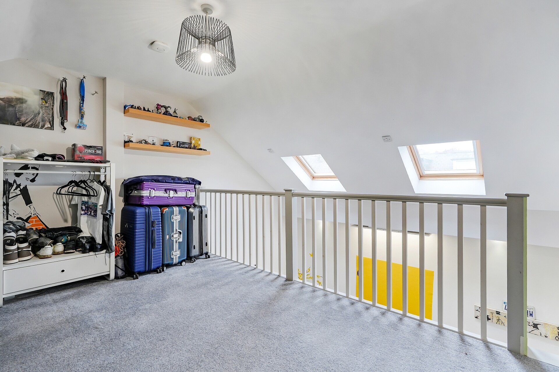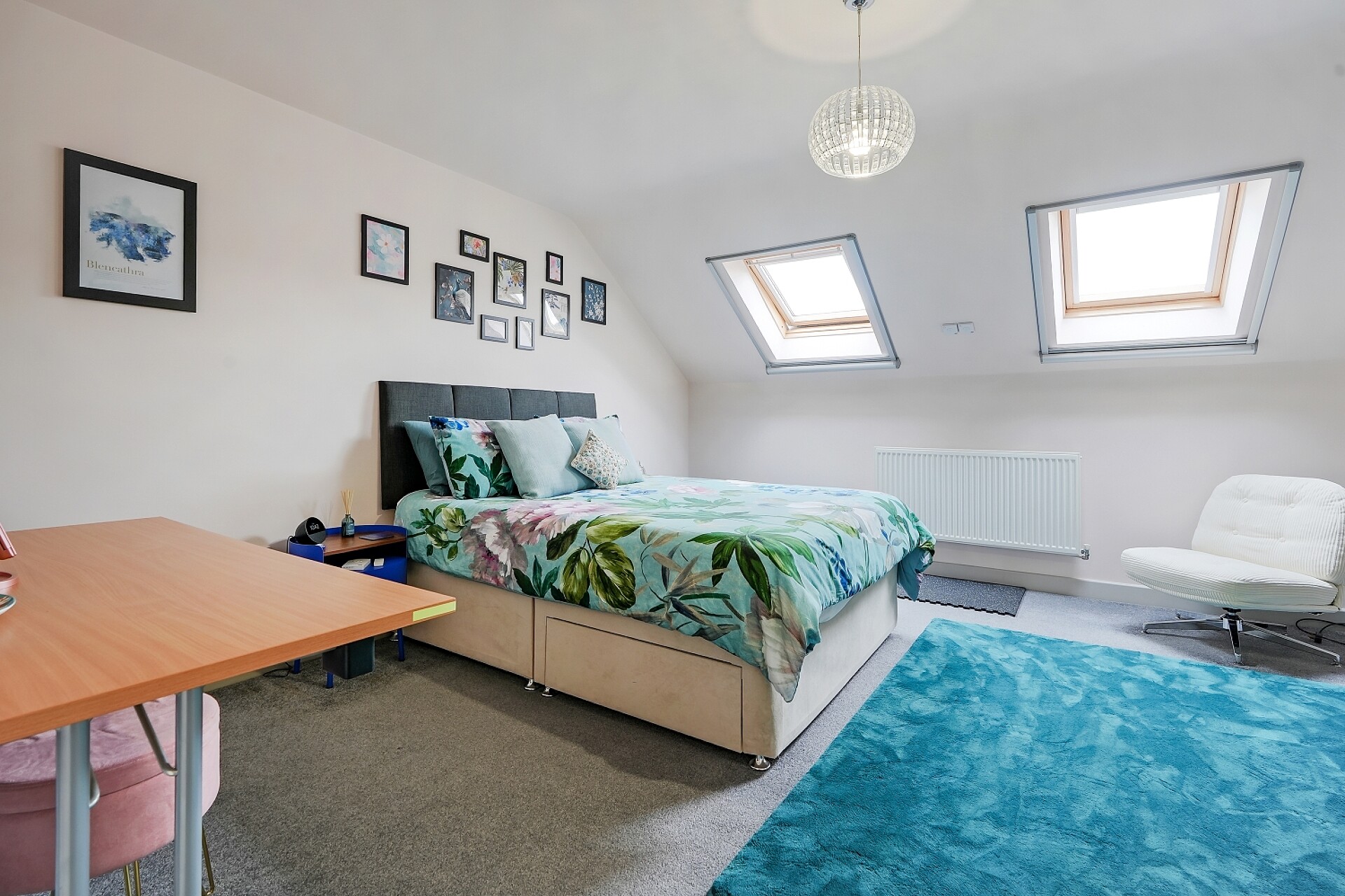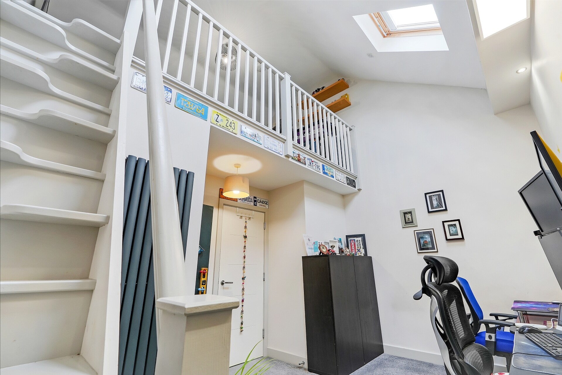 The second floor provides two further generous double bedrooms. Bedroom two benefits from two front-facing Velux windows, while bedroom three enjoys two rear-facing Velux windows and stairs leading to an impressive mezzanine level above. This additional space offers exceptional flexibility and could be used as a study area, reading space, dressing area, or occasional workspace.