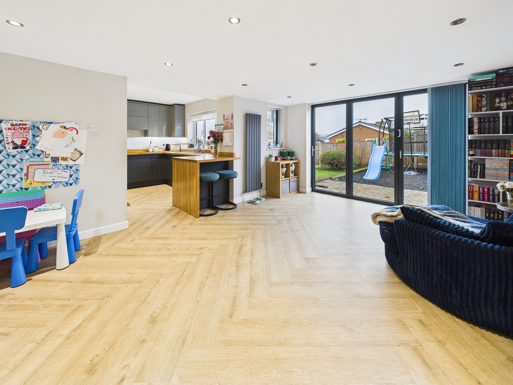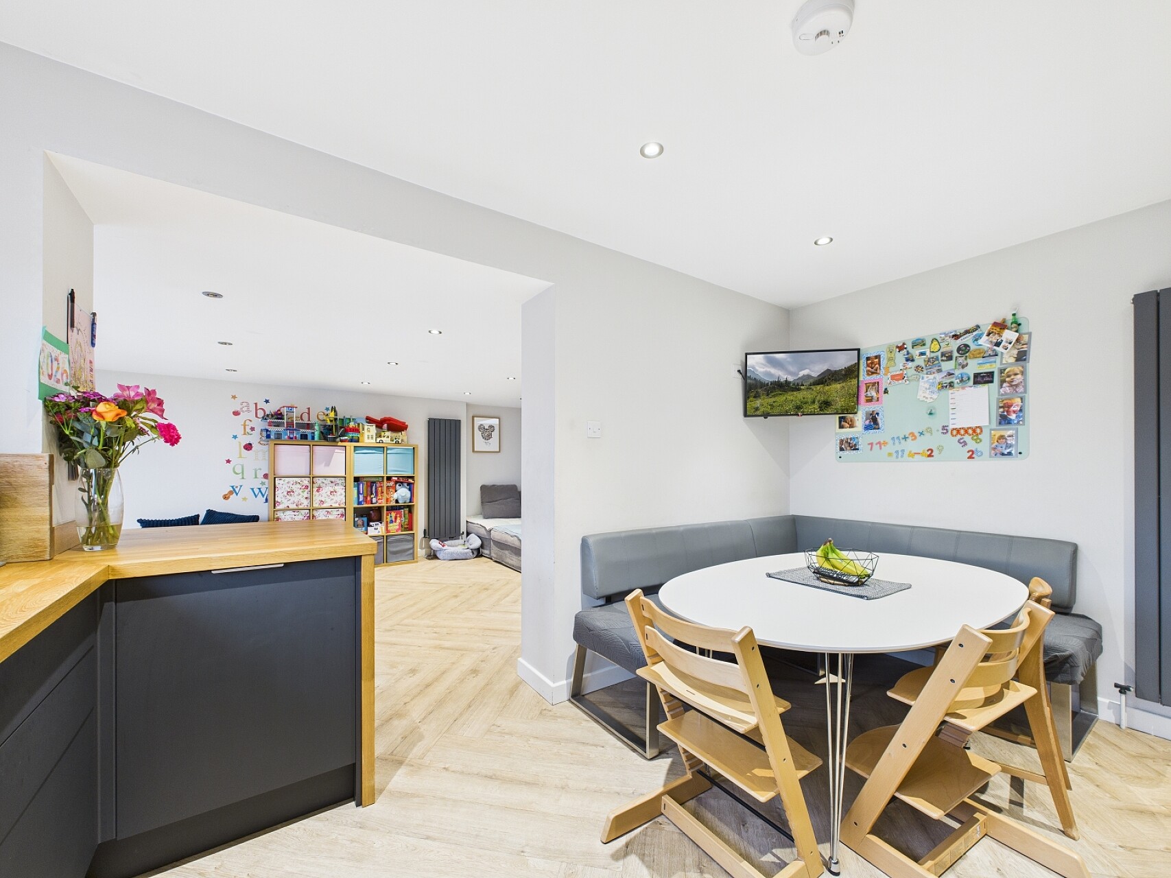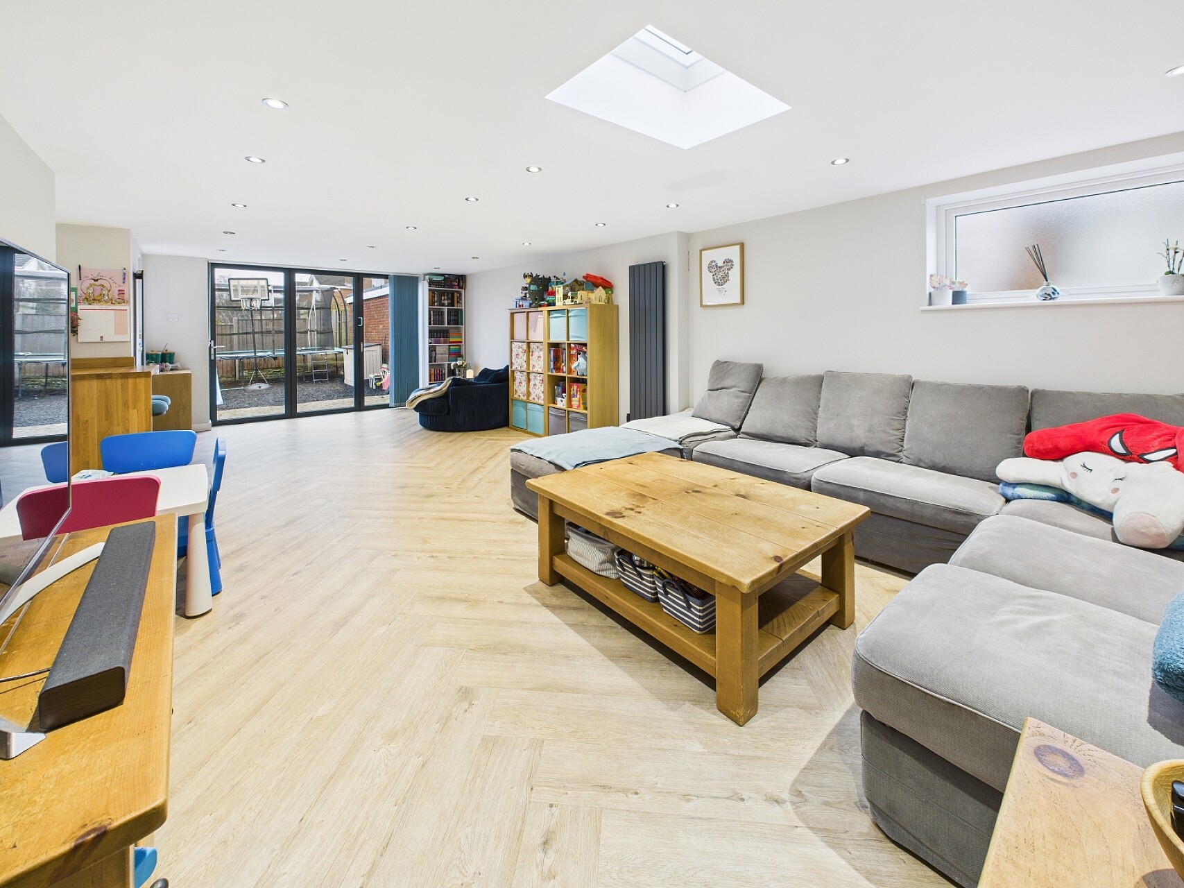 At the heart of the home is an impressive open plan living space, flooded with natural light and perfectly suited for modern lifestyles. Bi-fold doors open seamlessly to the rear garden, creating an excellent flow for indoor-outdoor living and entertaining. This leads into a contemporary dining kitchen, fitted with sleek modern units and a full range of integrated appliances, forming a true social hub of the home. Additional Velux windows enhance the light and airy feel, making this a superb space for both everyday living and social occasions.