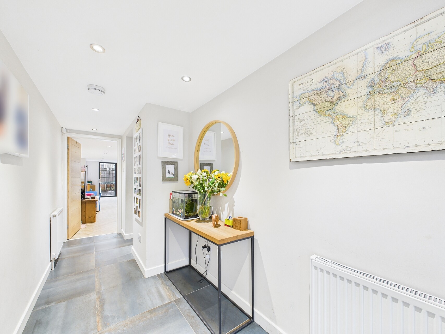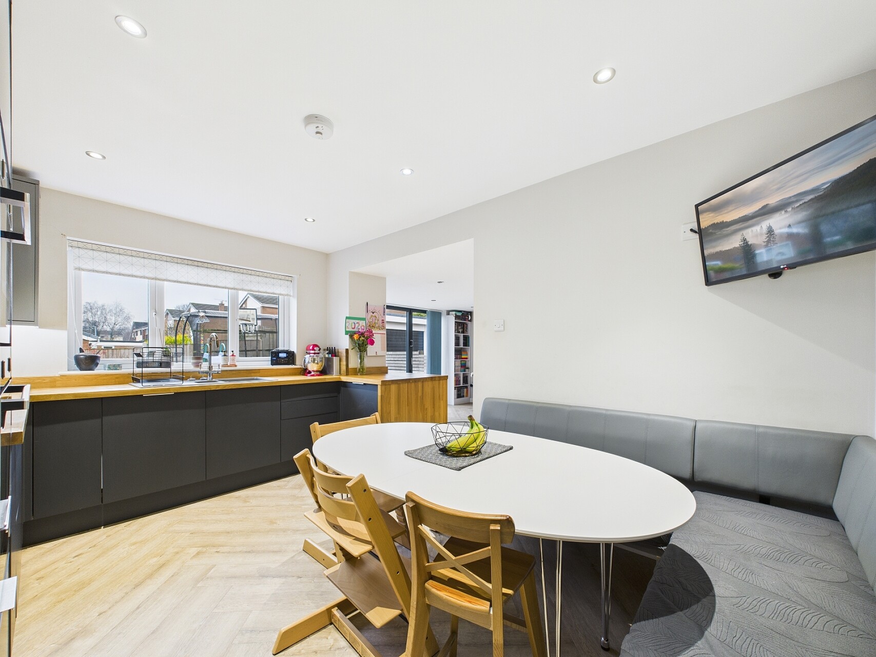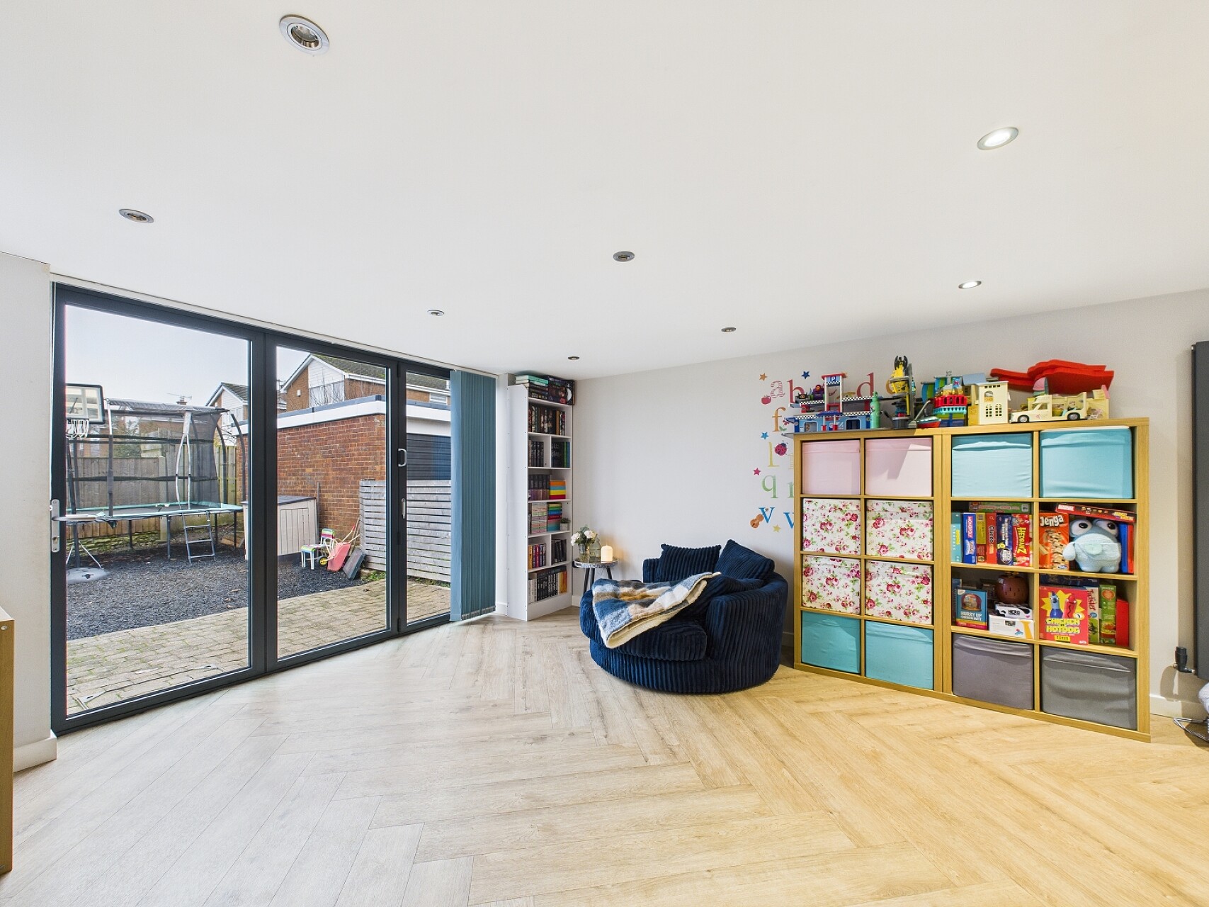 At the heart of the home is an impressive open plan living space, flooded with natural light and perfectly suited for modern lifestyles. Bi-fold doors open seamlessly to the rear garden, creating an excellent flow for indoor-outdoor living and entertaining. This leads into a contemporary dining kitchen, fitted with sleek modern units and a full range of integrated appliances, forming a true social hub of the home. Additional Velux windows enhance the light and airy feel, making this a superb space for both everyday living and social occasions.