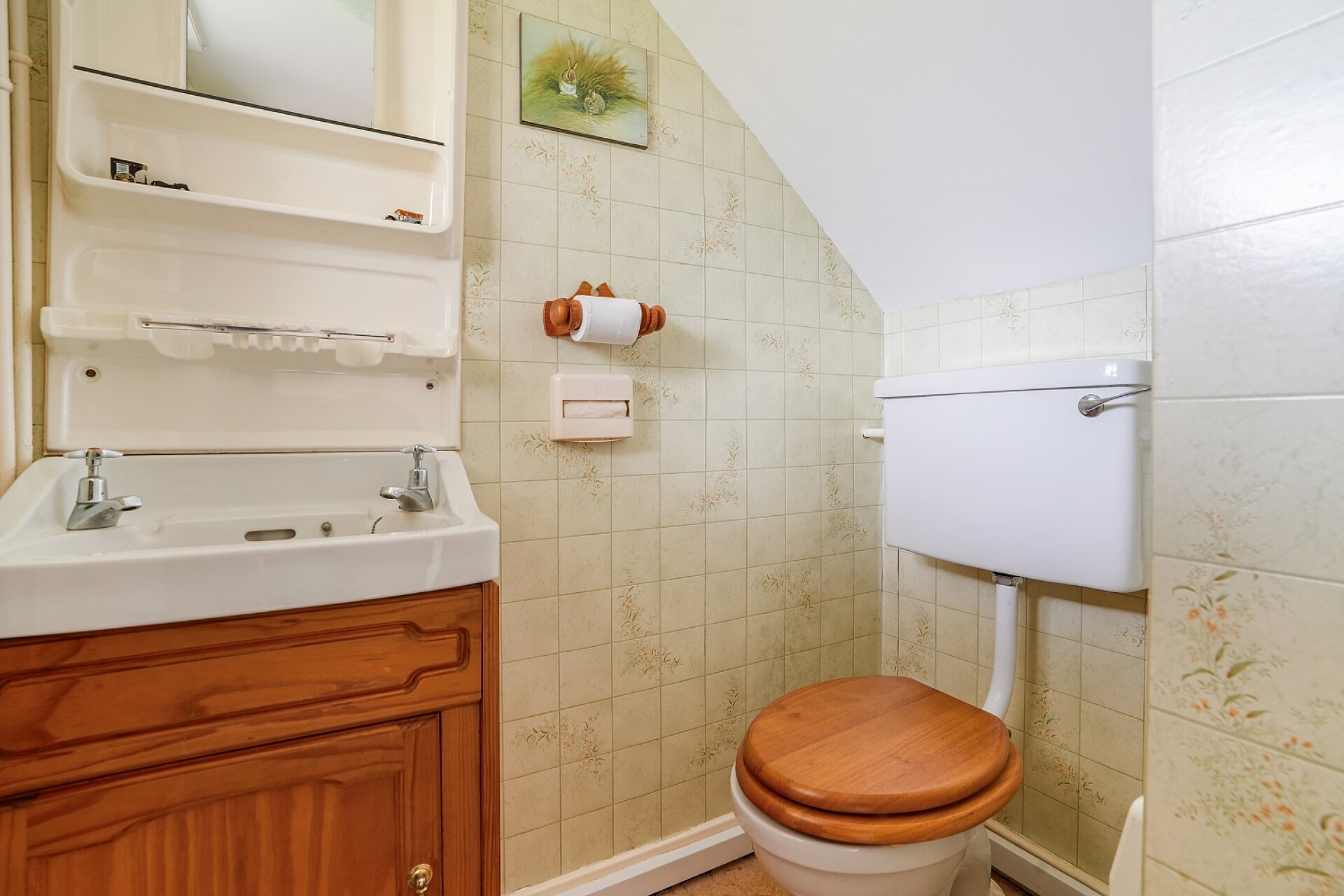 The family bathroom is fully tiled and fitted with a low-level WC, pedestal wash hand basin, and a bath with shower over.