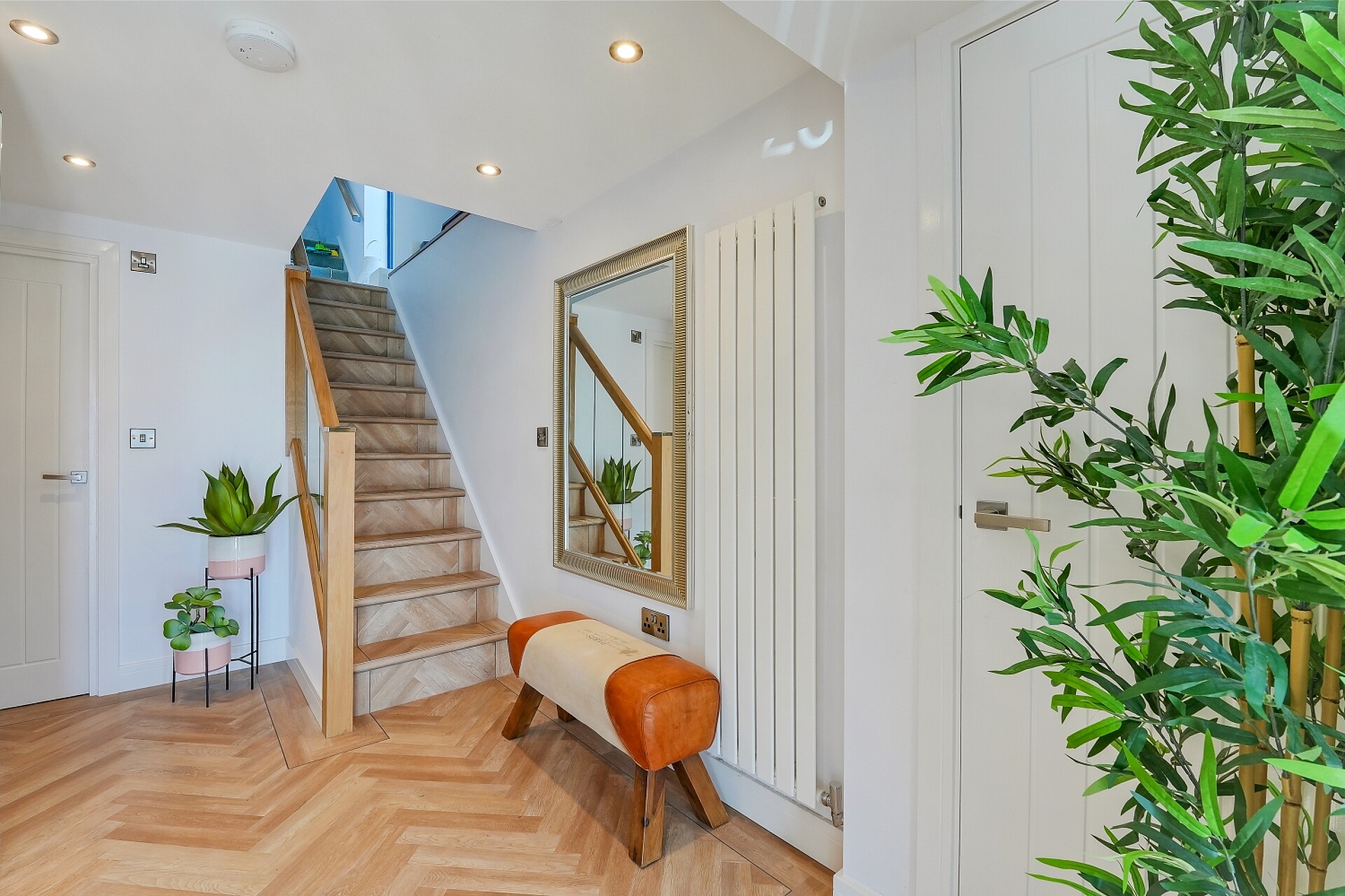 Accommodation in brief comprises a welcoming and spacious entrance hallway featuring contemporary LVT herringbone style flooring, an attractive glass and oak balustrade staircase, and an impressive aluminium front-facing entrance door with adjacent glazed panel allowing excellent natural light.