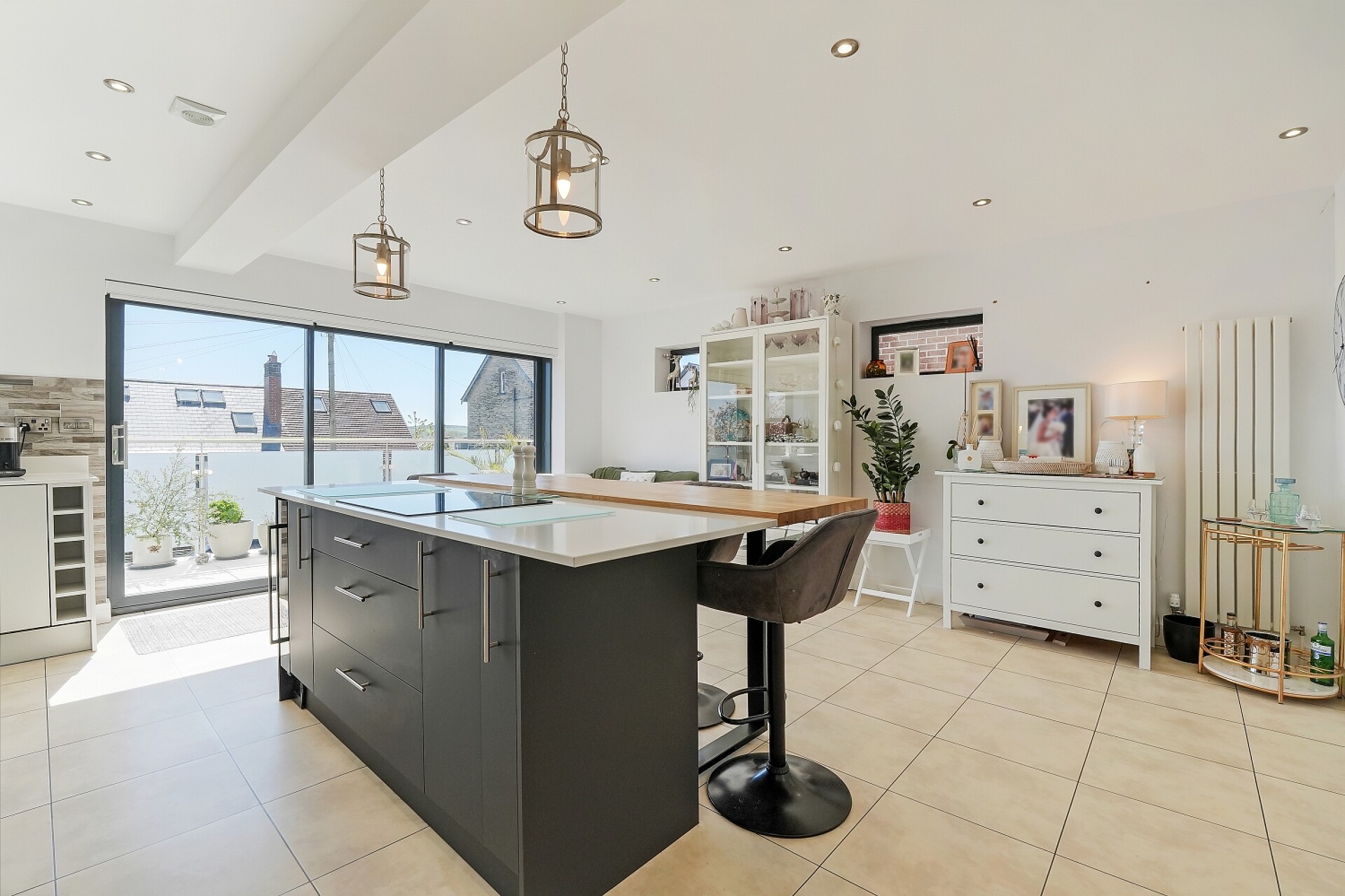 The first-floor landing is beautifully illuminated by a striking side-facing floor-to-ceiling feature window and leads through to the stunning open-plan kitchen diner — undoubtedly one of the standout features of the home. This impressive entertaining space boasts a comprehensive range of stylish fitted wall and base units with integrated appliances, elegant quartz worktops, and a substantial breakfast island ideal for both everyday living and social occasions. Large premium-grade aluminium sliding doors open onto a superb front-facing balcony with glazed balustrading and tiled flooring, enjoying far-reaching elevated views. The entire first floor benefits from luxurious underfloor heating and beautiful LVT herringbone style flooring.