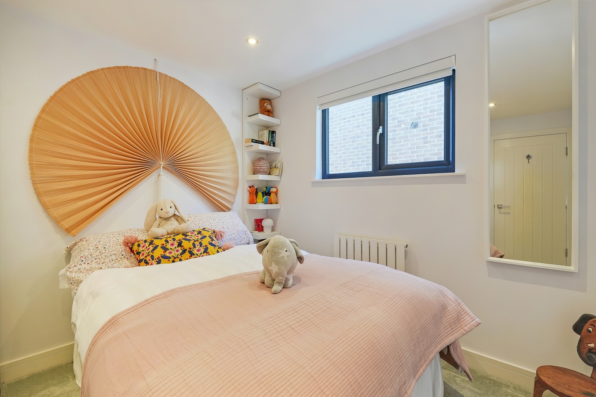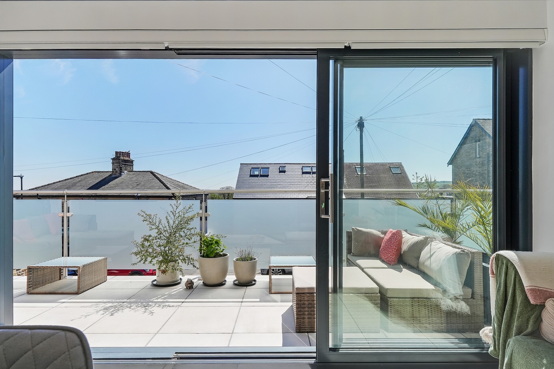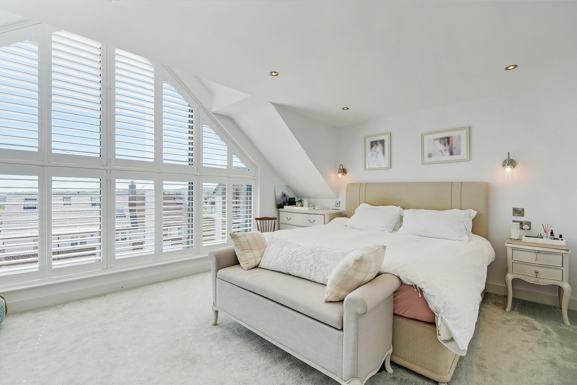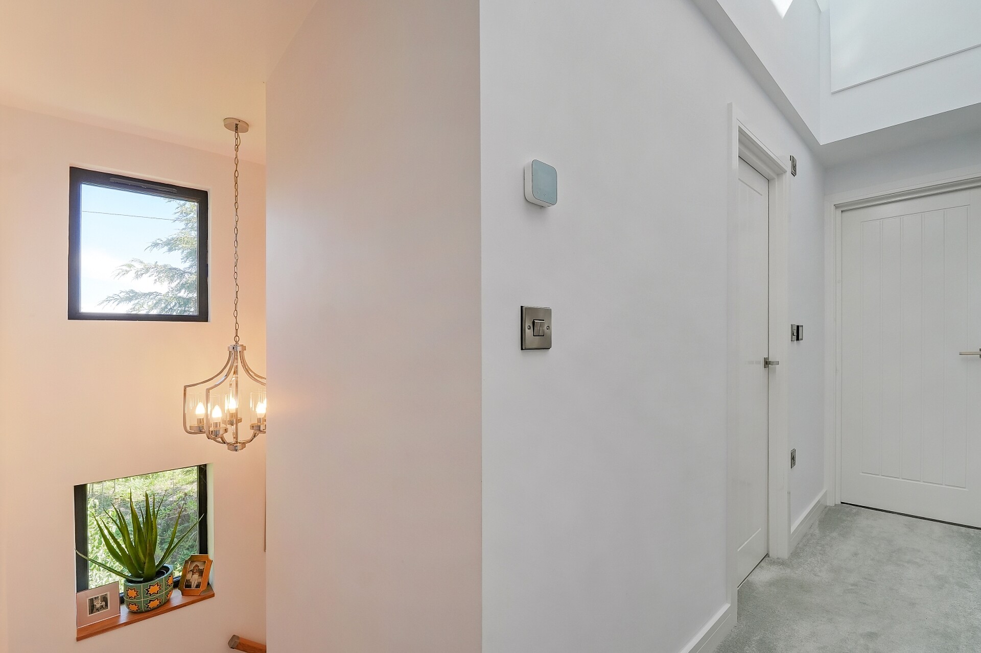 To the second floor, the landing area is bright and airy thanks to three large Velux roof windows. The principal bedroom is truly exceptional, featuring a striking fully glazed gable end with plantation shutters taking in fabulous far reaching panoramic views, fitted wardrobes, and a stylish en-suite shower room comprising a low flush WC, vanity wash basin, and walk-in shower enclosure. Bedroom two is a further generous double bedroom with fitted wardrobes across one wall and a rear-facing window overlooking the garden. Bedroom three is another well-proportioned double bedroom with side-facing window.