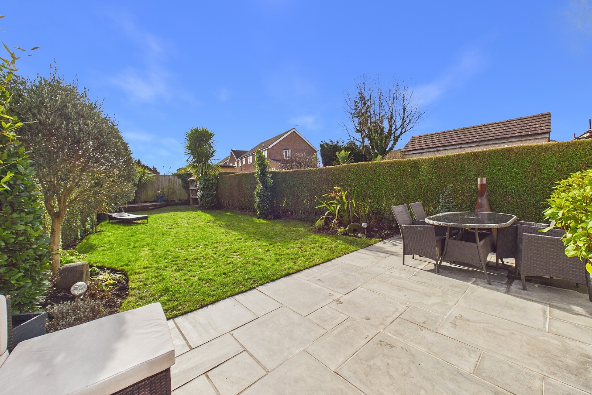 To the rear is a delightful garden with an open outlook with 2 patio areas for relaxing or entertaining and a lawn for playing.