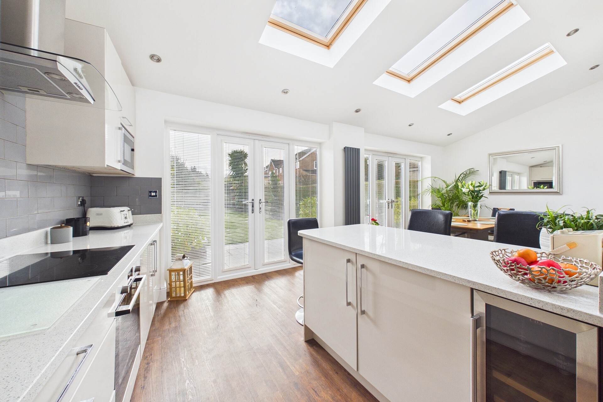 Next is the standout feature of the house, the stunning open plan kitchen, dining and living area. Offering a perfect space for the family to be together or for entertaining, this huge room has it all. Light floods in from the skylights and double patio doors that offer a lovely view across the garden. The kitchen space is modern and stylish with high gloss fitted units, quartz worktops, peninsular and a range of integrated appliances.