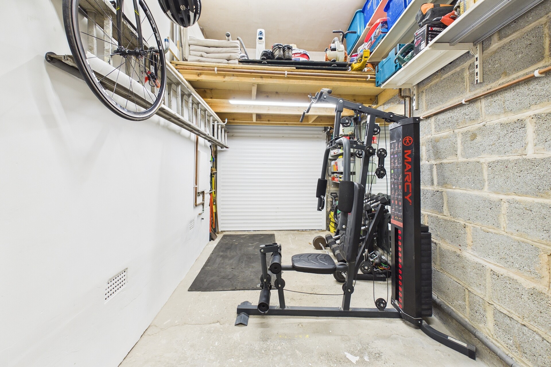 To the front is driveway offering off road parking and an integrated garage that is currently used as a gym that also has a handy mezzanine storage space.