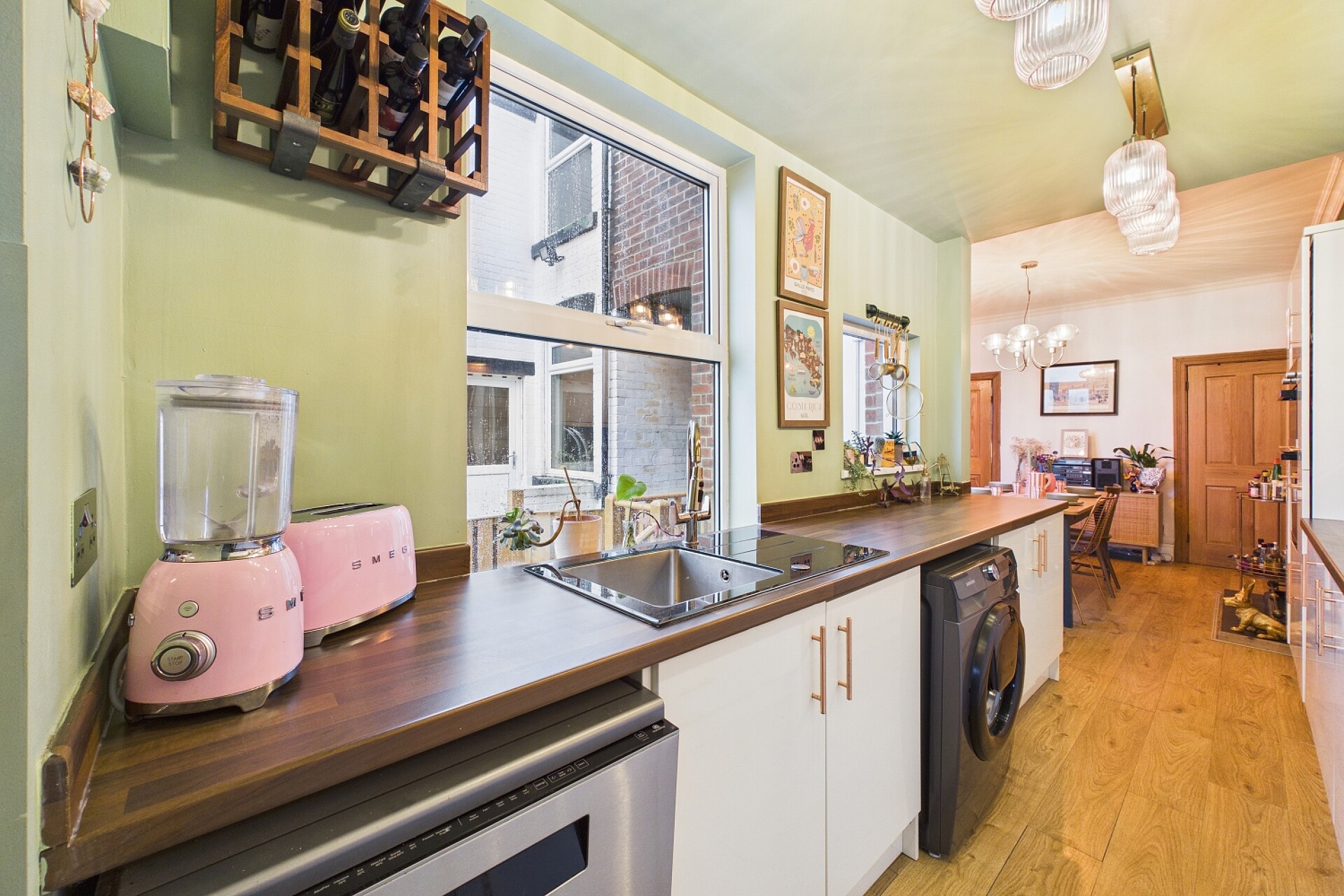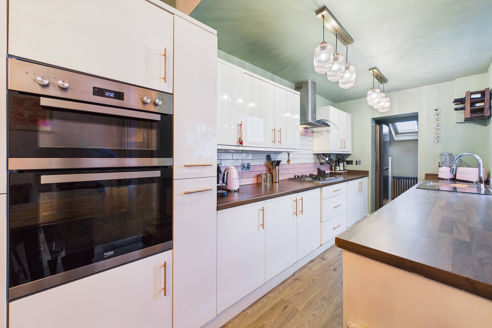Enjoying an excellent range of modern fitted wall and base units which incorporate a built-in stainless steel double electric oven with 5 ring gas hob and extractor hood. There is space and plumbing for both a dishwasher and washing machine. Wood effect worktops with a stainless-steel sink unit and drainer with mixer tap. To the end is an additional room that houses the free-standing fridge freezer with additional storage space.