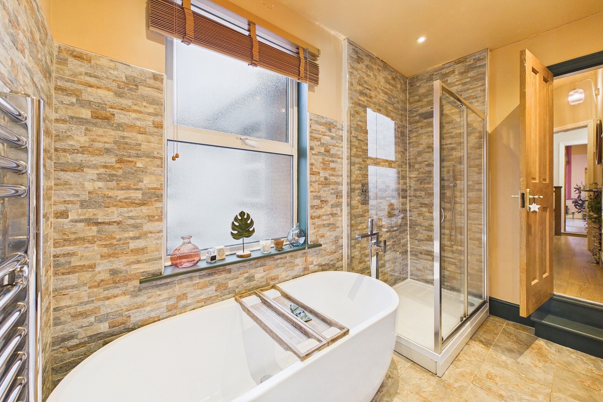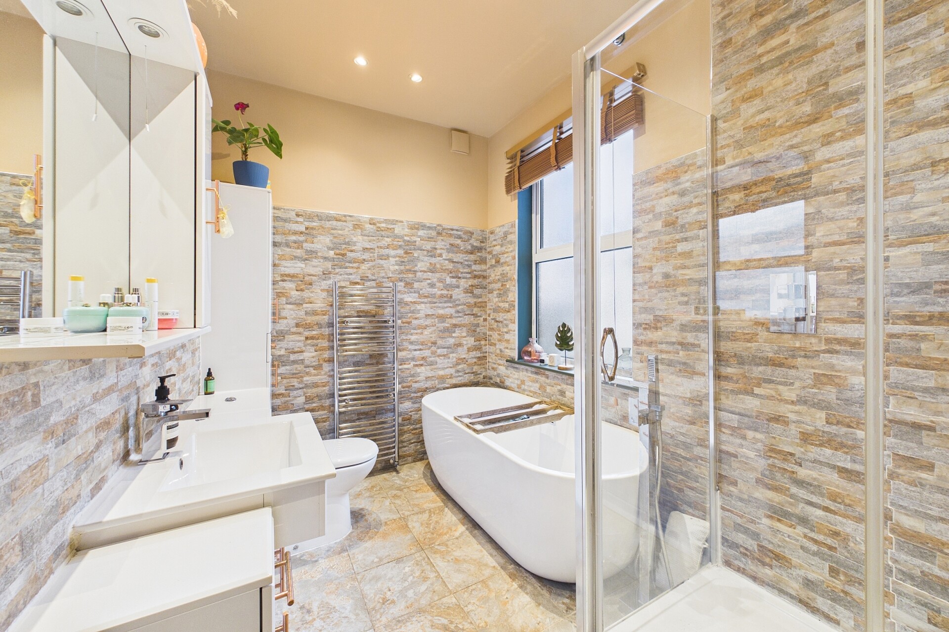 The bathroom is a generous space which has been attractively decorated and includes a wide shower cubicle and large freestanding bath. The sink and WC form part of a large vanity unit that offers plenty of storage.