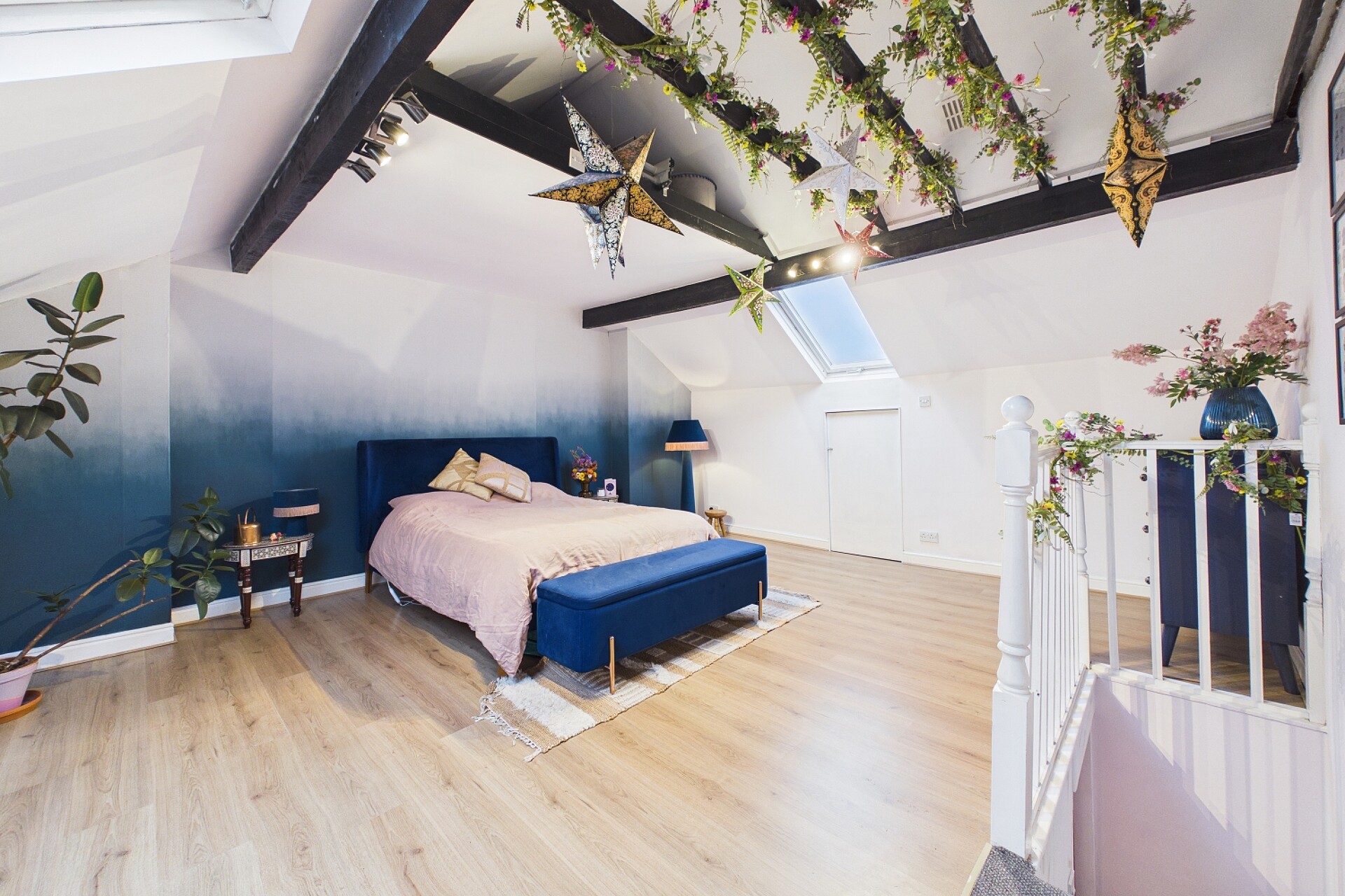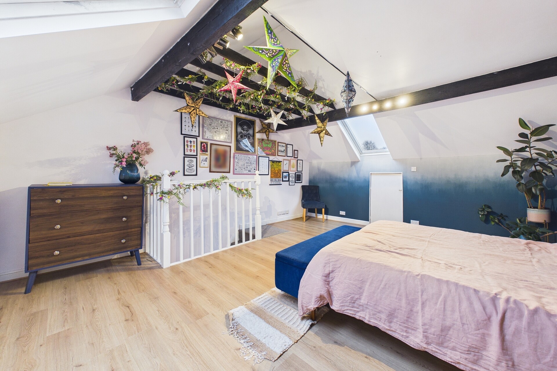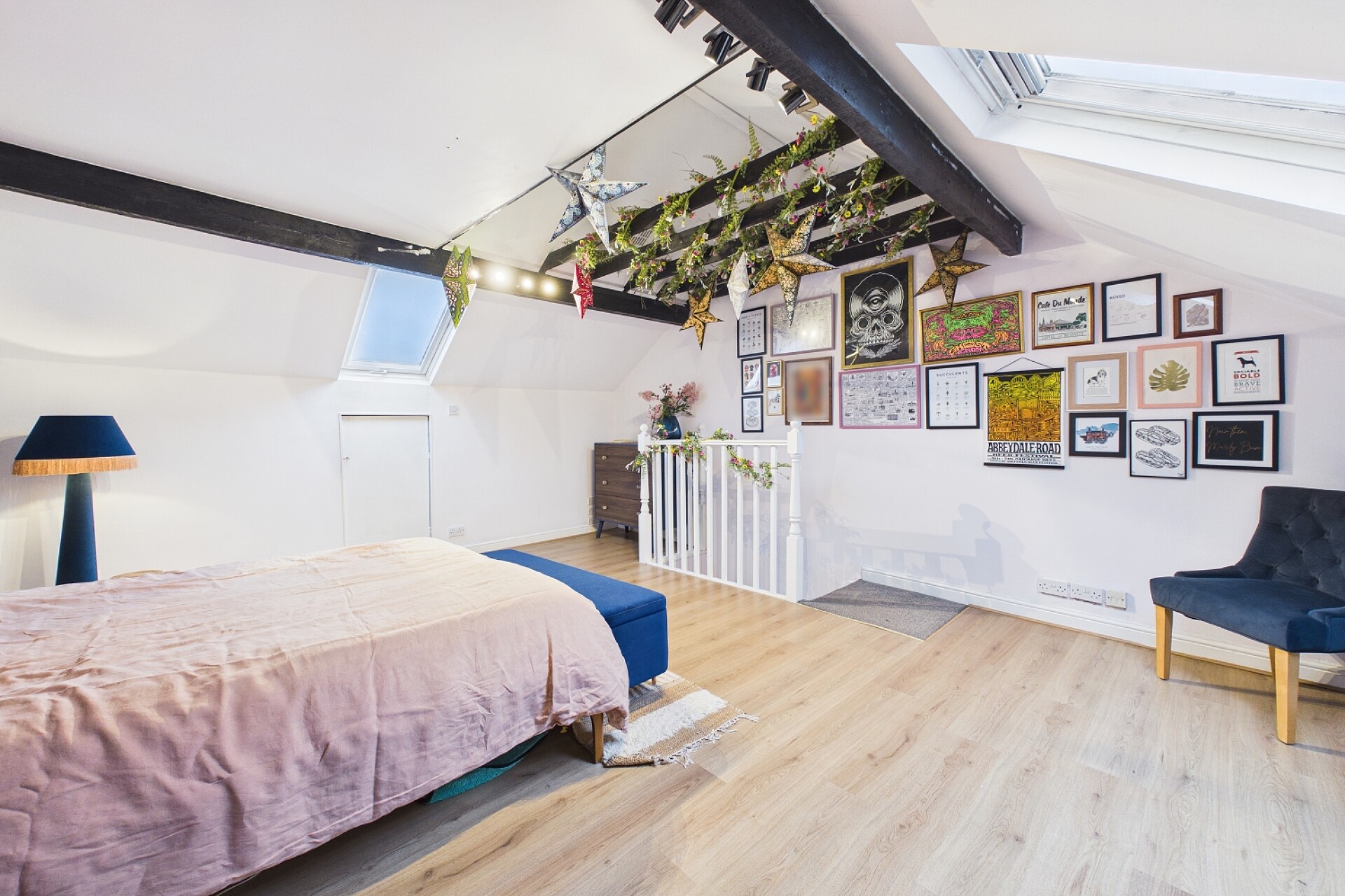 Up to the top floor and bedroom 4 is a large, impressive and stylish room with exposed beams and ample natural light from the skylight windows to both sides. There is also the benefit of additional storage in the eaves.