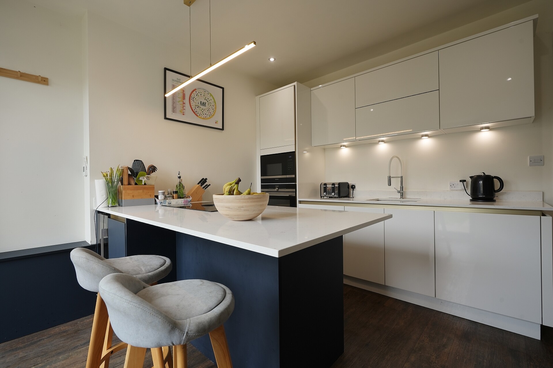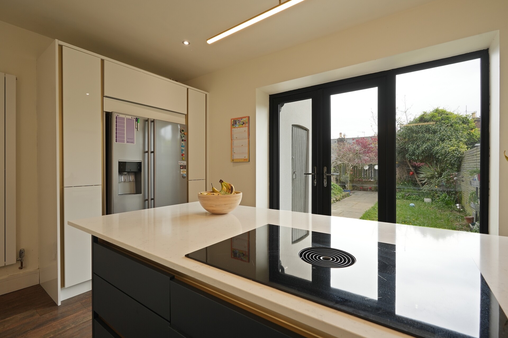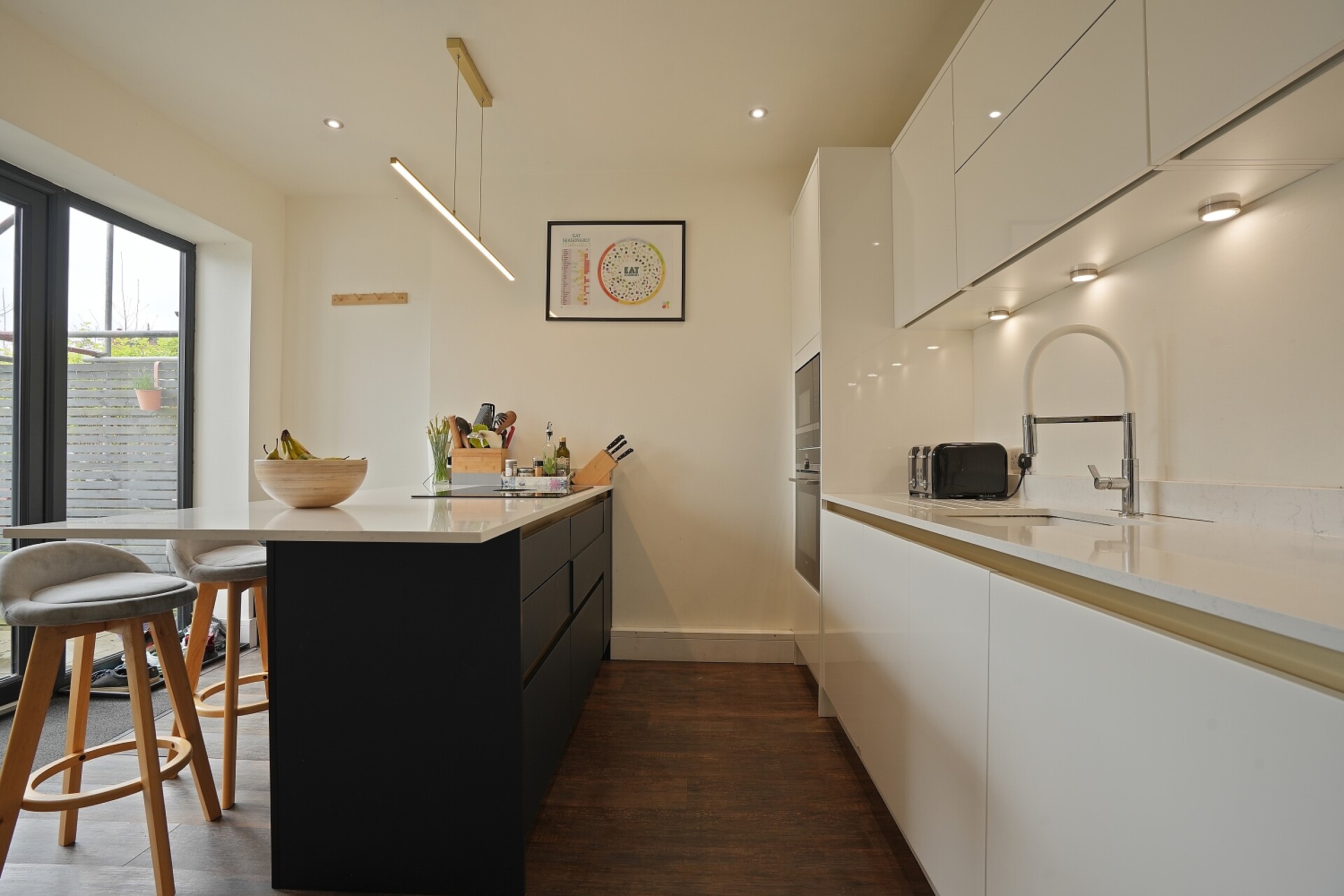 The basement level forms the heart of the home, boasting a stunning open-plan kitchen diner fitted with an extensive range of contemporary units and integrated appliances including built-in oven, microwave and hob. Beautiful Quartz worktops and a substantial breakfasting island create a stylish and practical entertaining space, while bi-fold doors open directly onto the rear garden, allowing indoor-outdoor living during warmer months. The room also profits from attractive flooring with under floor heating. A useful utility area with ample space for white goods and a large workshop/store complete this level.