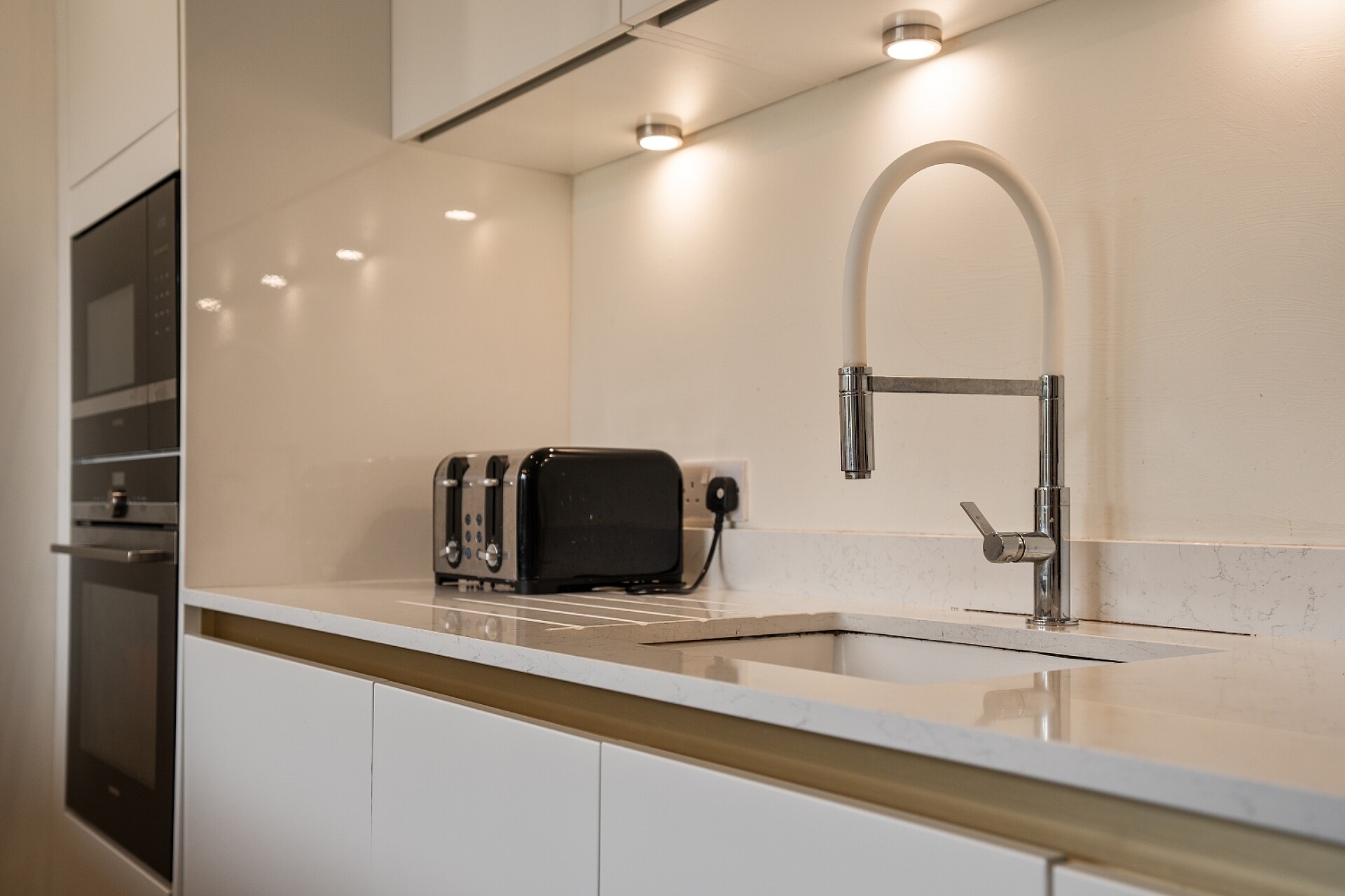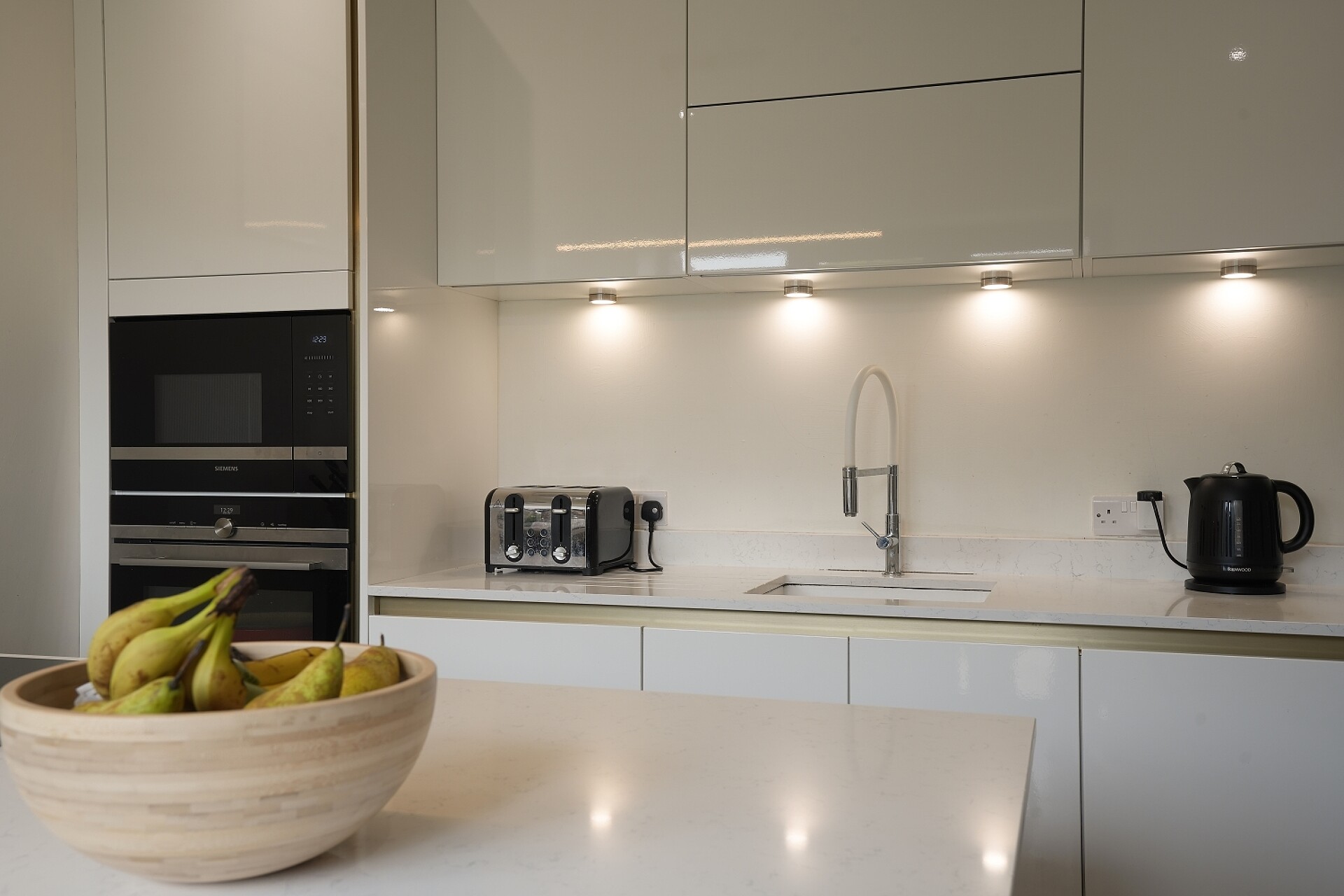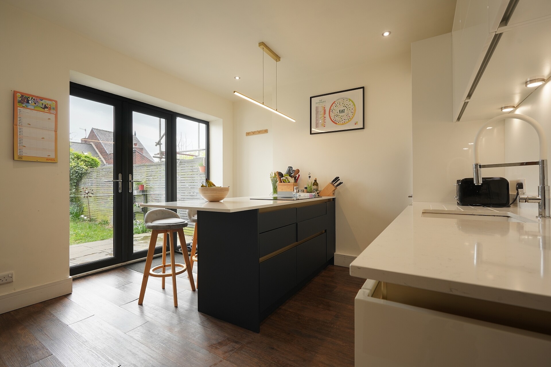 The basement level forms the heart of the home, boasting a stunning open-plan kitchen diner fitted with an extensive range of contemporary units and integrated appliances including built-in oven, microwave and hob. Beautiful Quartz worktops and a substantial breakfasting island create a stylish and practical entertaining space, while bi-fold doors open directly onto the rear garden, allowing indoor-outdoor living during warmer months. The room also profits from attractive flooring with under floor heating. A useful utility area with ample space for white goods and a large workshop/store complete this level.