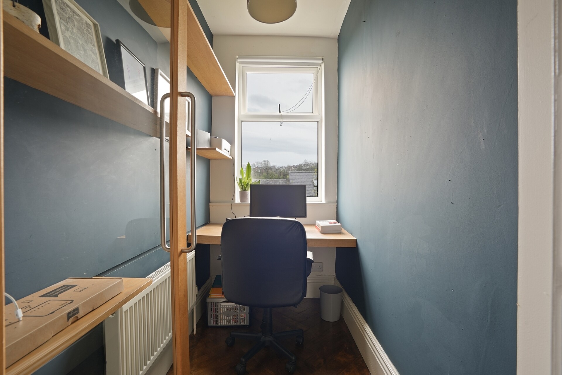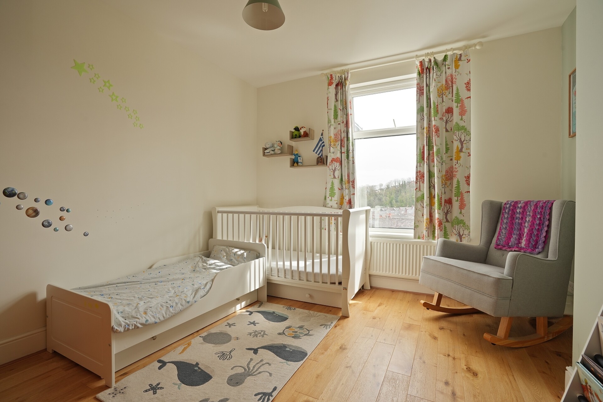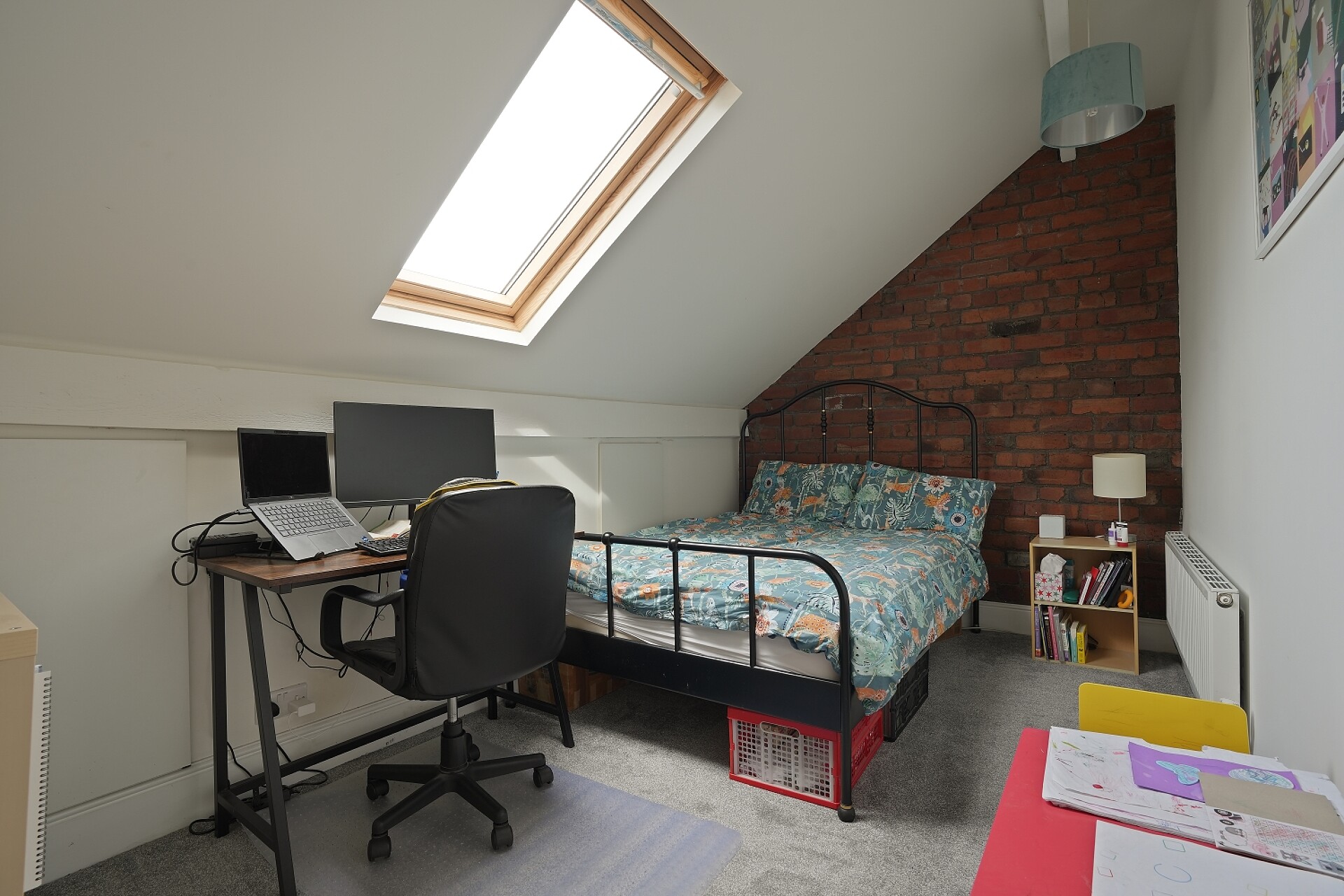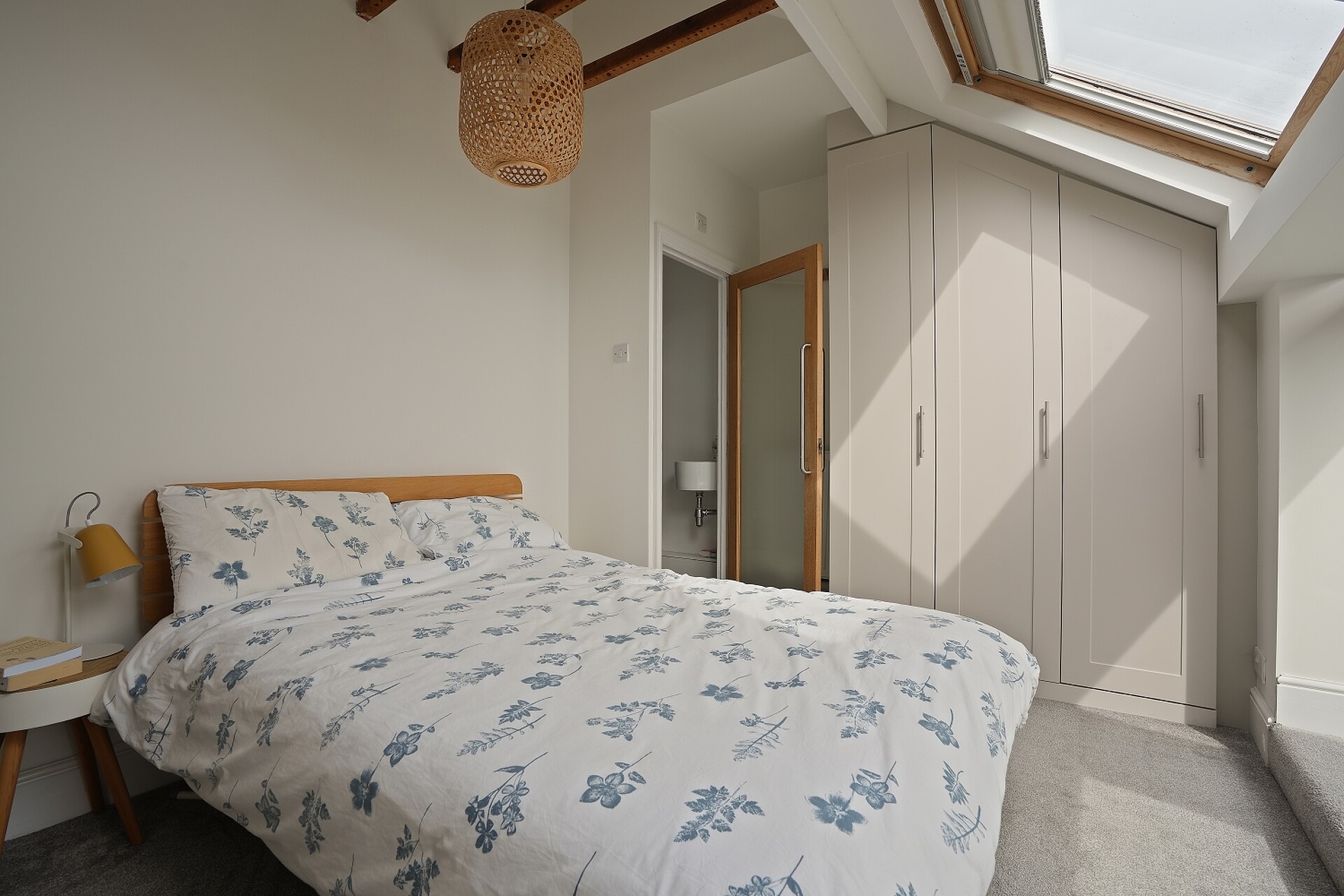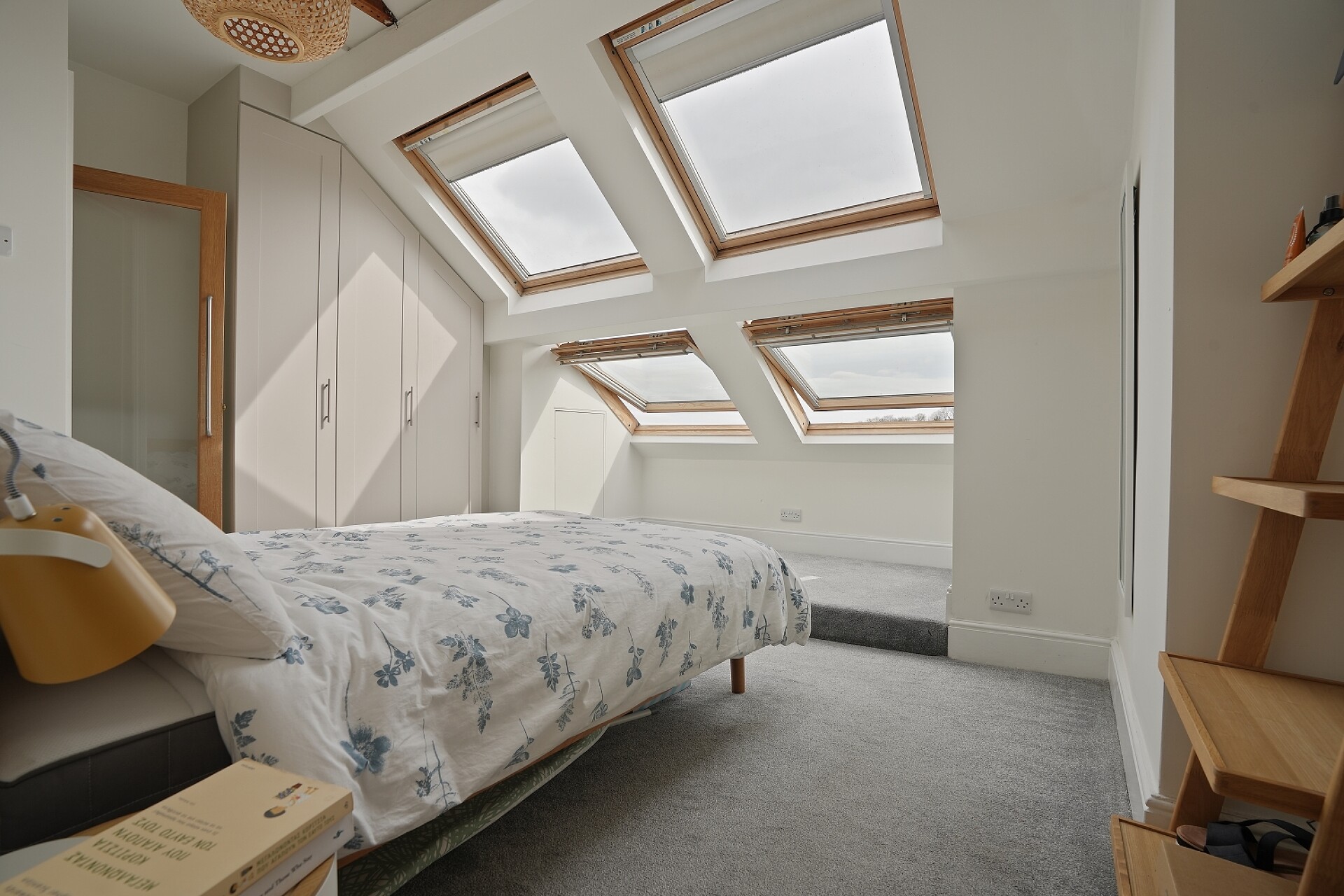The second floor hosts two further bedrooms, including a superb principal bedroom suite flooded with natural light from four large rear-facing Velux windows, offering spectacular far-reaching views. This room also benefits from a modern ensuite shower room. Bedroom four is another well-proportioned double room with a front-facing Velux window.