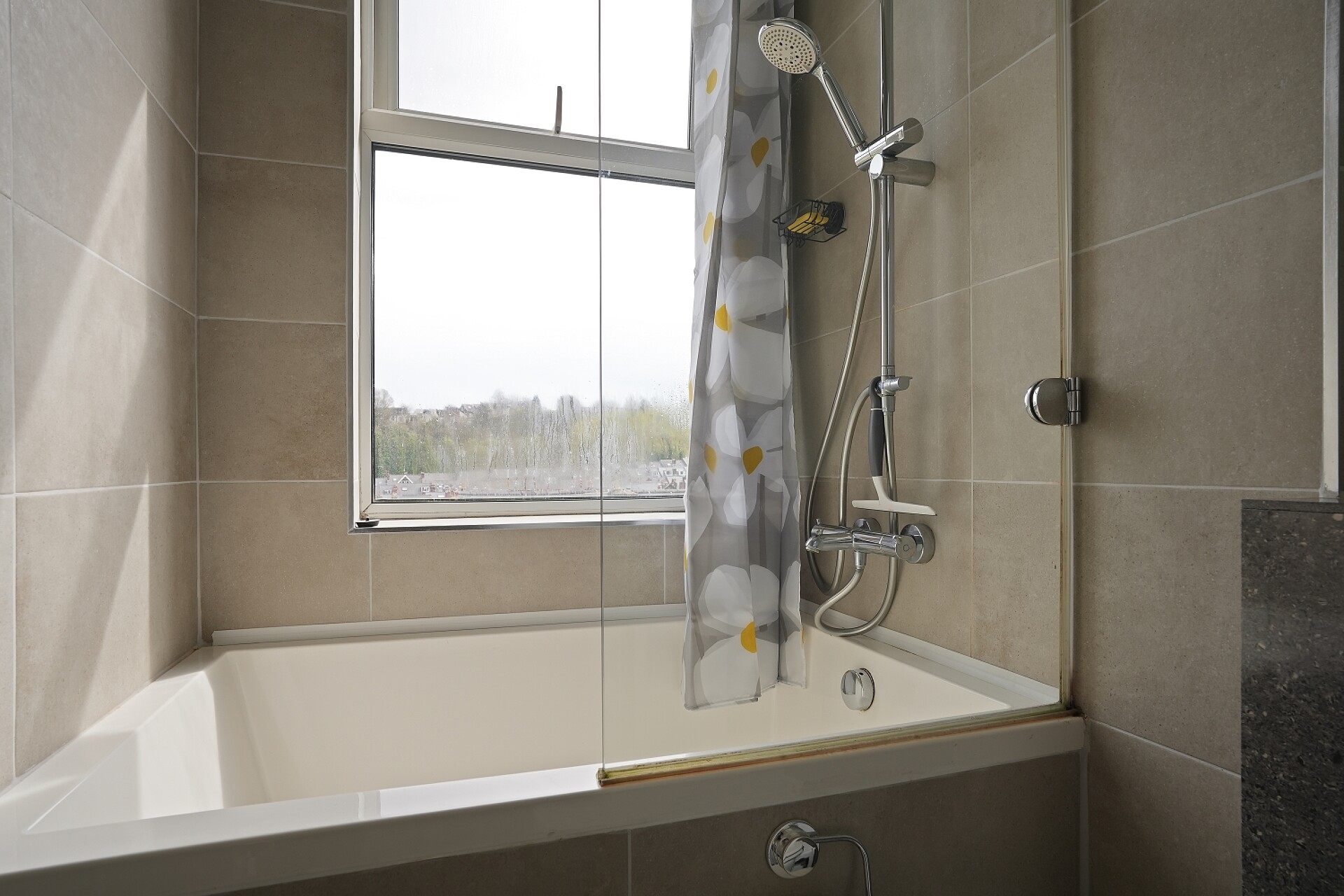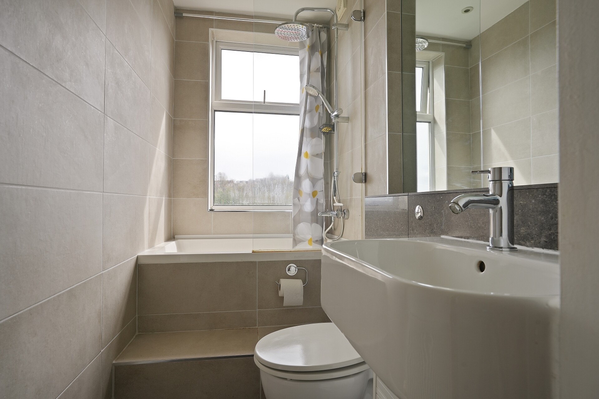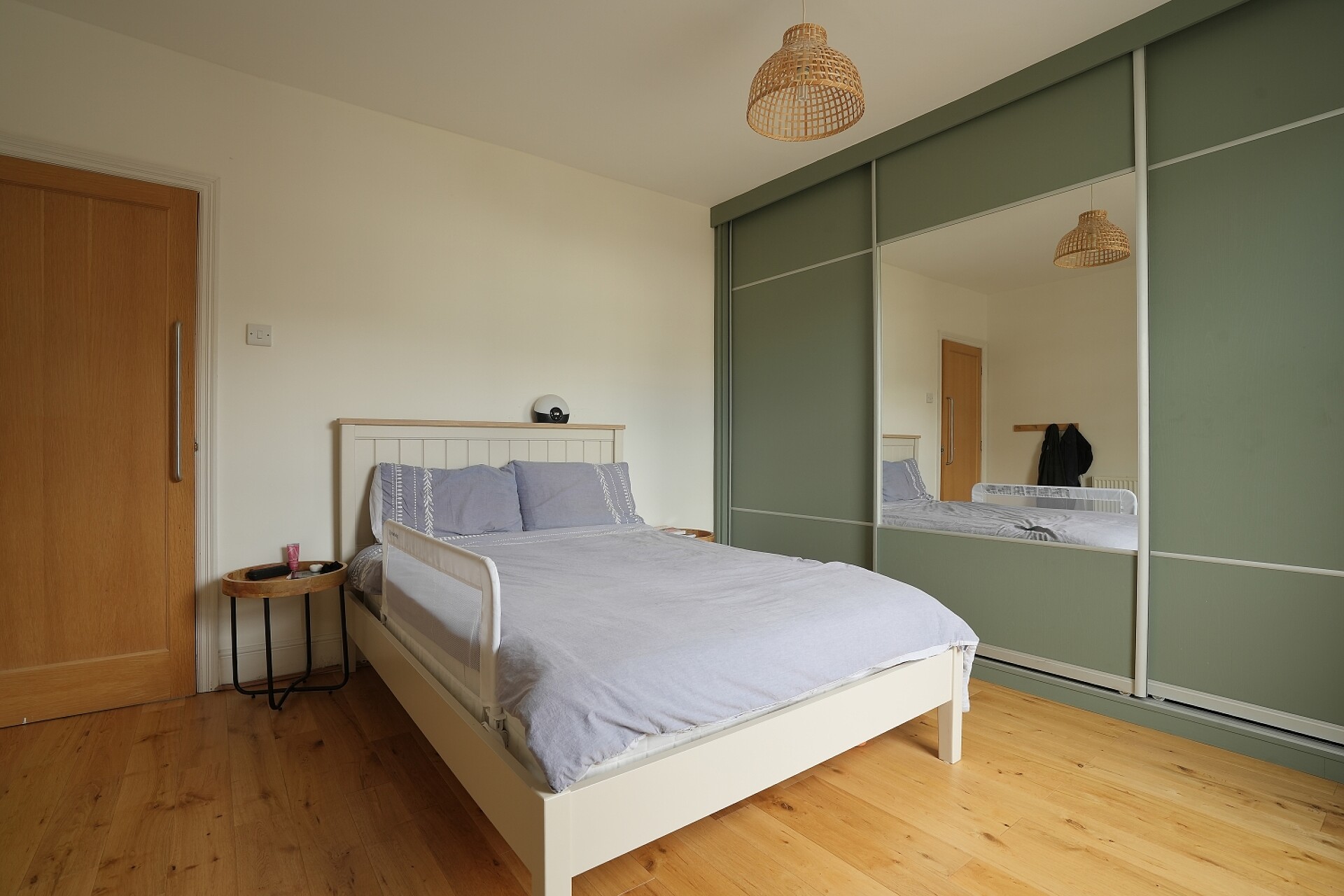 To the first floor, a spacious landing provides access to two generous double bedrooms and the family bathroom. The front-facing bedroom features attractive engineered oak flooring and fitted wardrobes across one wall, while the rear double bedroom also benefits from engineered oak flooring and enjoys stunning panoramic views. The family bathroom is beautifully tiled and comprises a bath with shower over and screen, pedestal wash basin, low flush WC, and rear window with open outlook.