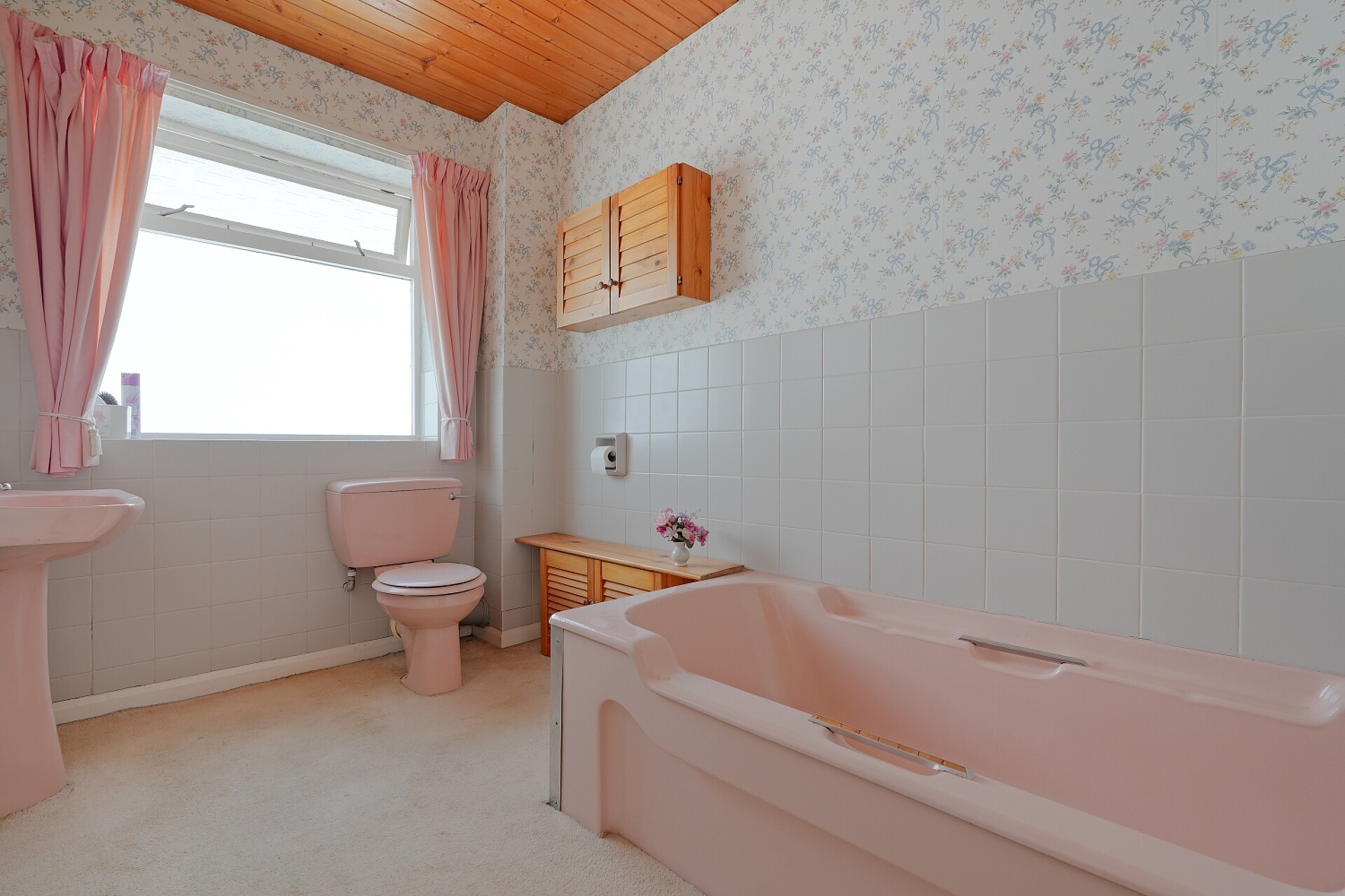 The family bathroom is fully tiled and fitted with a bath, pedestal wash hand basin, low-flush WC, and obscure-glazed side window.